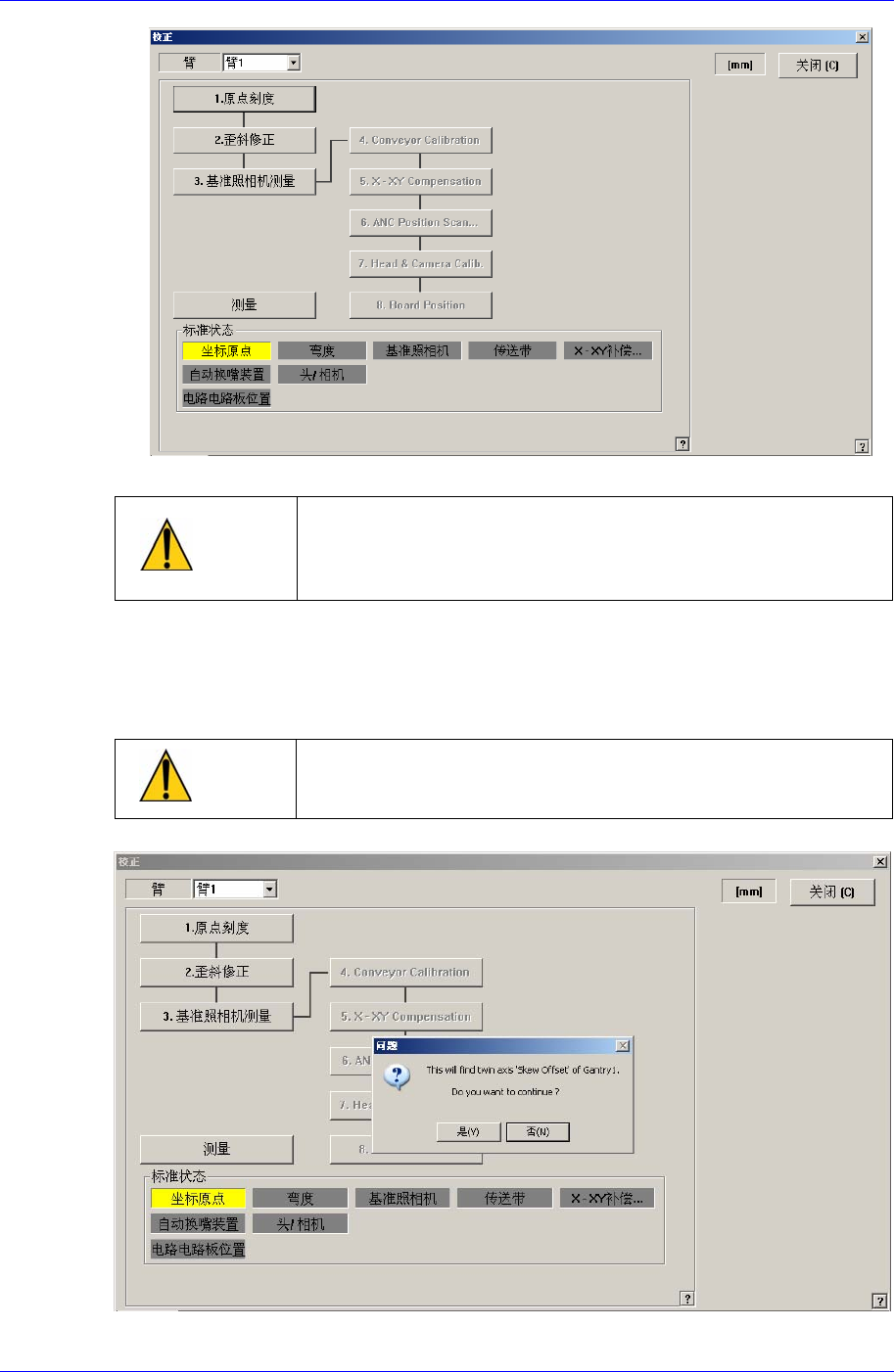 Skew 意味着设备移动后对 Y1 和 Y2 轴 X 轴不形成垂直状态,补偿发生的歪斜。