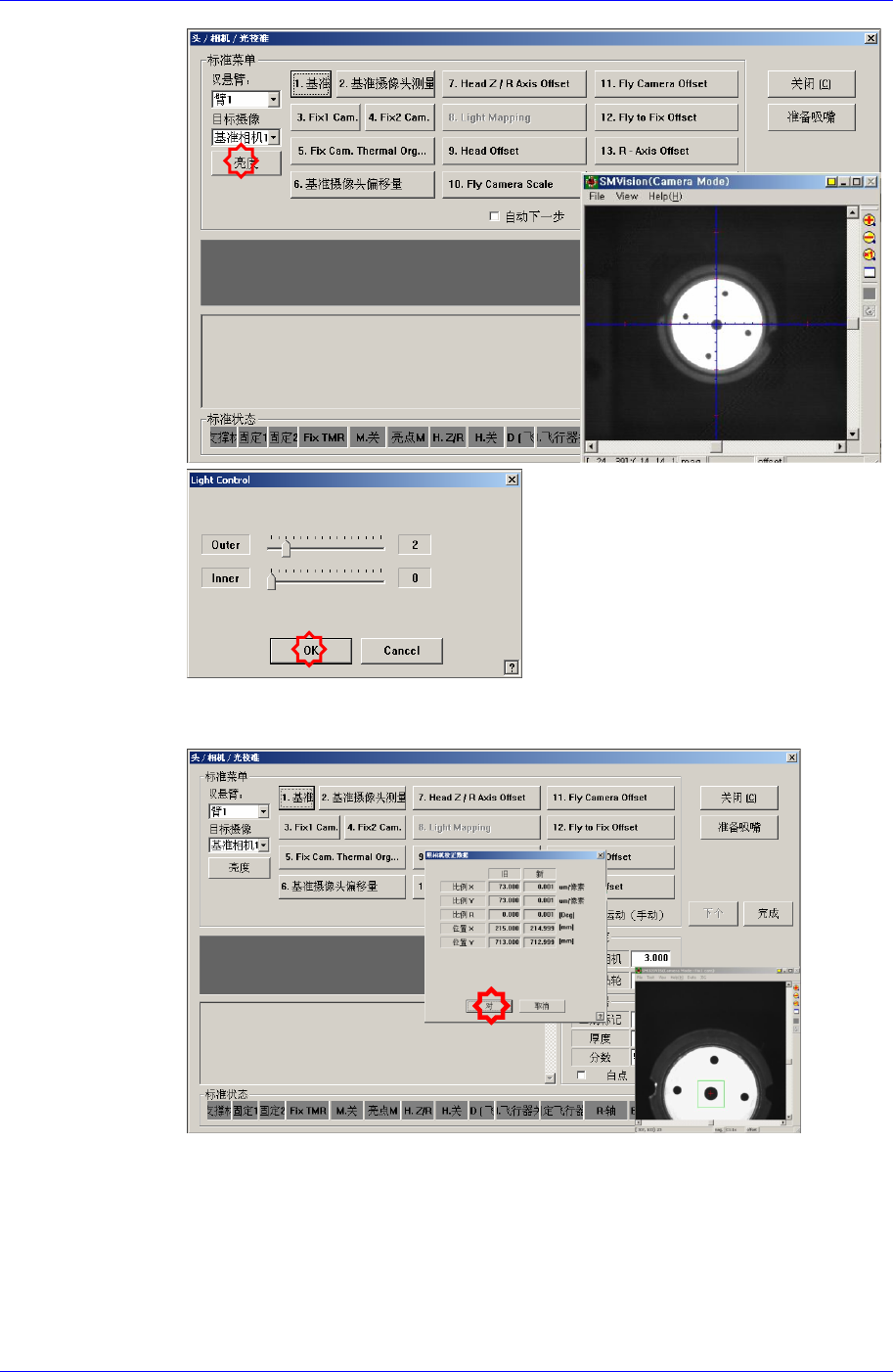 要先执行固定相机的 Scale 矫正才能执行 Fiducial Camera Offset 矫正。