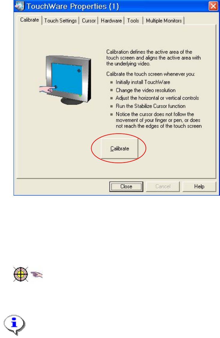 Installation Manual, Station Software Version 602.01 Edition 06/2006 Fig. 4-7: TouchWare Properties – Calibrate tab (example for Monitor 1) → Click the Calibrate button. An icon representing the ca libration is shown on …