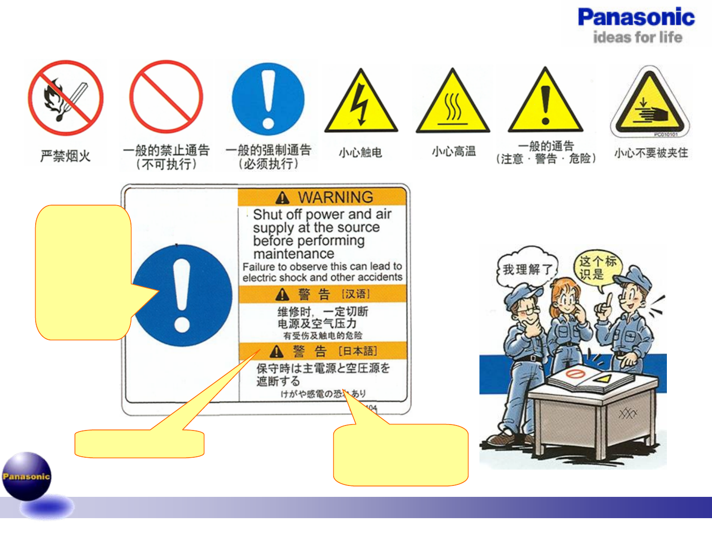 1.0-070301 4/26 理解实装机的标识图案。 引起注意的 标识图案 用标识图案 表示请遵守 的内容。 表示危险程度。 表示指示文章 以文章说明遵守 的内容。
