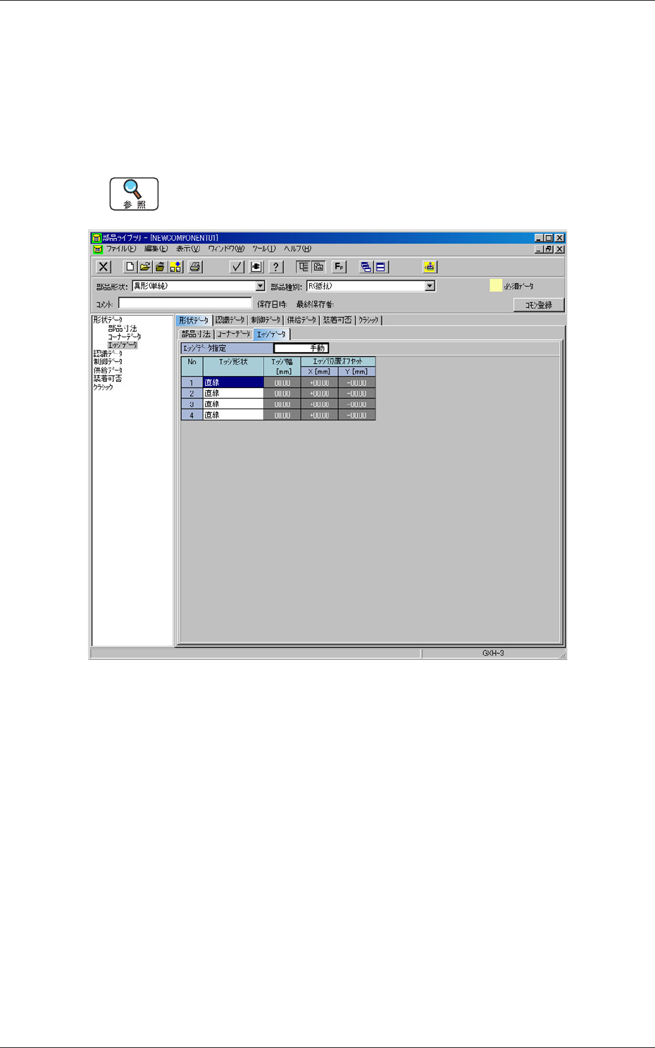 Tg0984-ID-OP 4-21 3.3 エッジデータ エッジデータは部品形状“異形”で設定する項目です。 “形状データ”タブシートの[エッジデータ]タブを押すと、以下の タブシートが表示されます。 各データの表示または入力を行えます。 データ項目の内容については、取扱説明書部品ライブラリ (GXH シ リーズ ) を参照してください。 Fig.D13 “エッジデータ”タブシートの例 3.3エッジデータ 0803-006