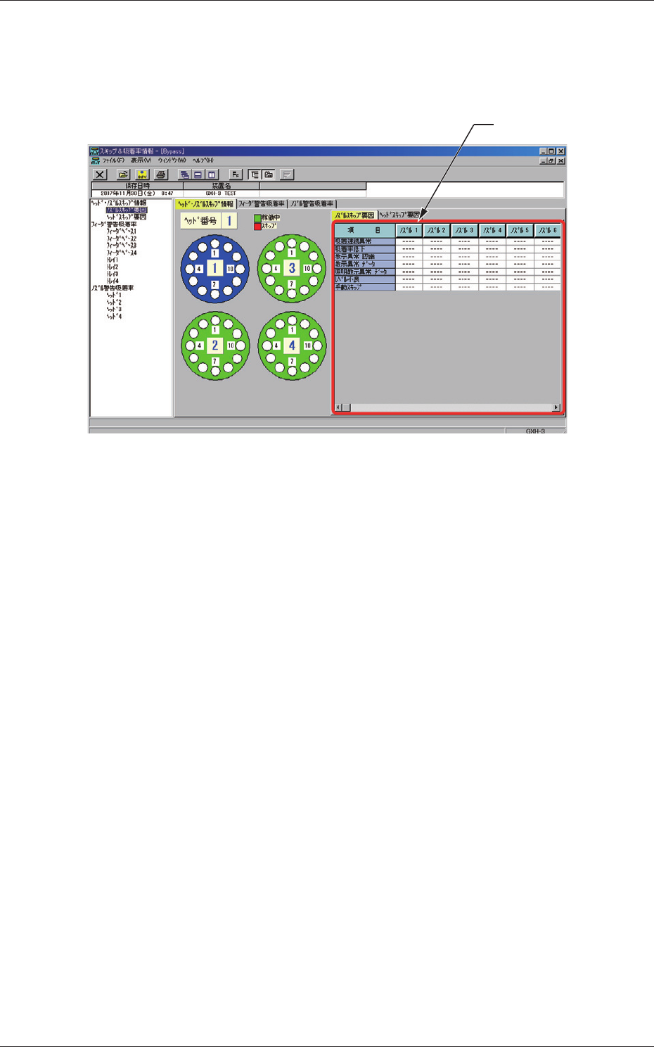 Tg0984-ID-OP 5-20 4.1.2 ヘッドスキップ要因 “ヘッド ・ ノズルスキップ情報” タブシートで、 [ ヘッドスキップ要因 ] タブを押すと、以下のタブシートが表示されます。 [1] Fig.E16“ヘッドスキップ要因”タブシート [1] 表示項目 “ヘッドスキップ要因”が表示されます。 4.1ヘッド・ノズルスキップ情報 0803-006