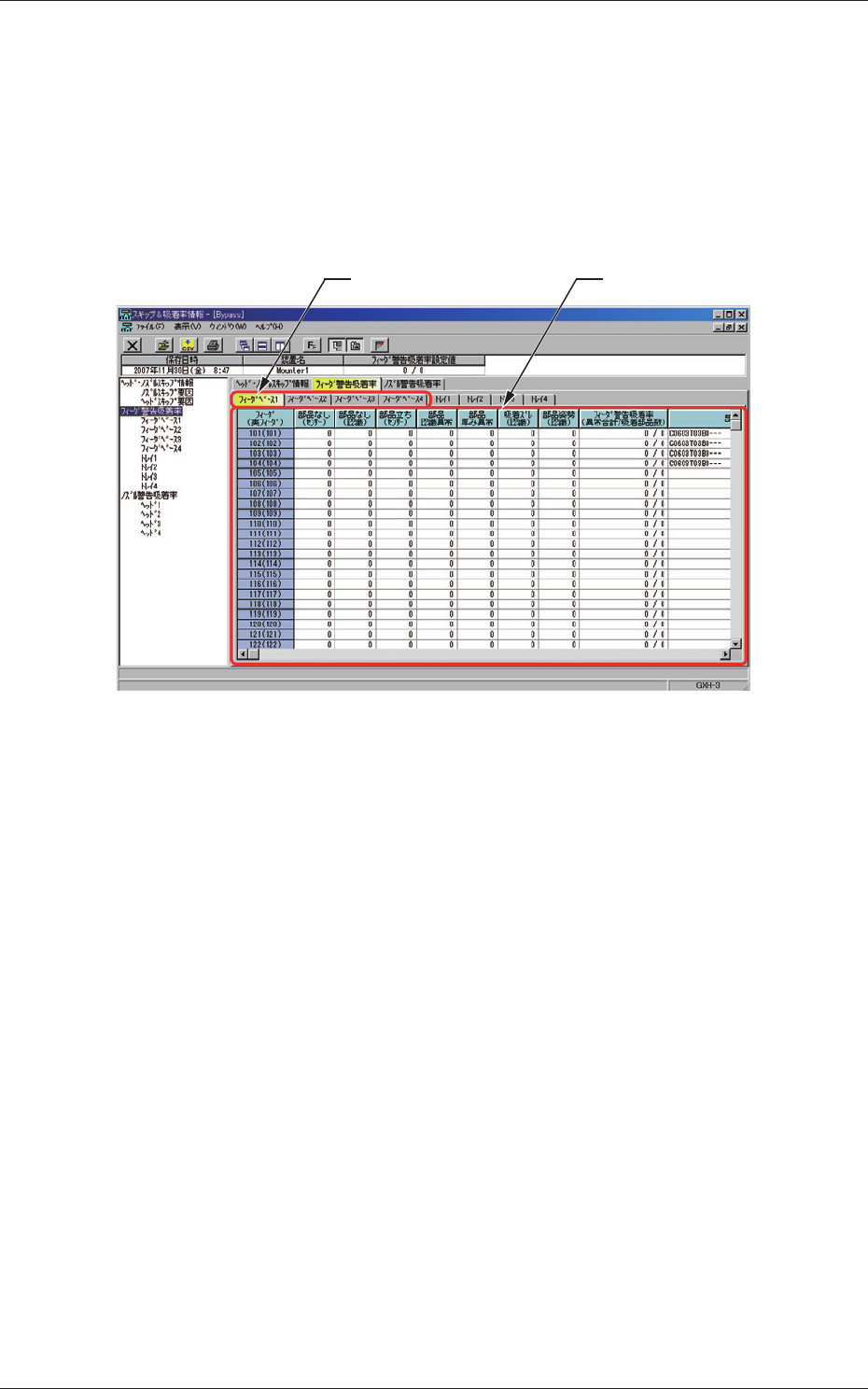 “スキップ & 吸着率情報”画面で、[ フィーダ警告吸着率 ] タブを押