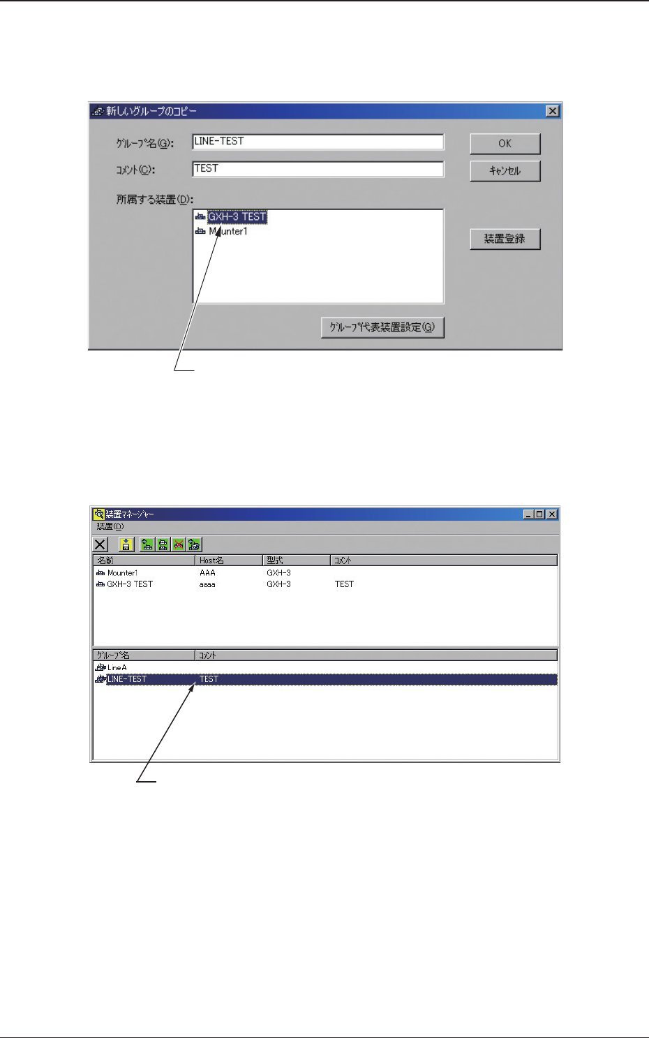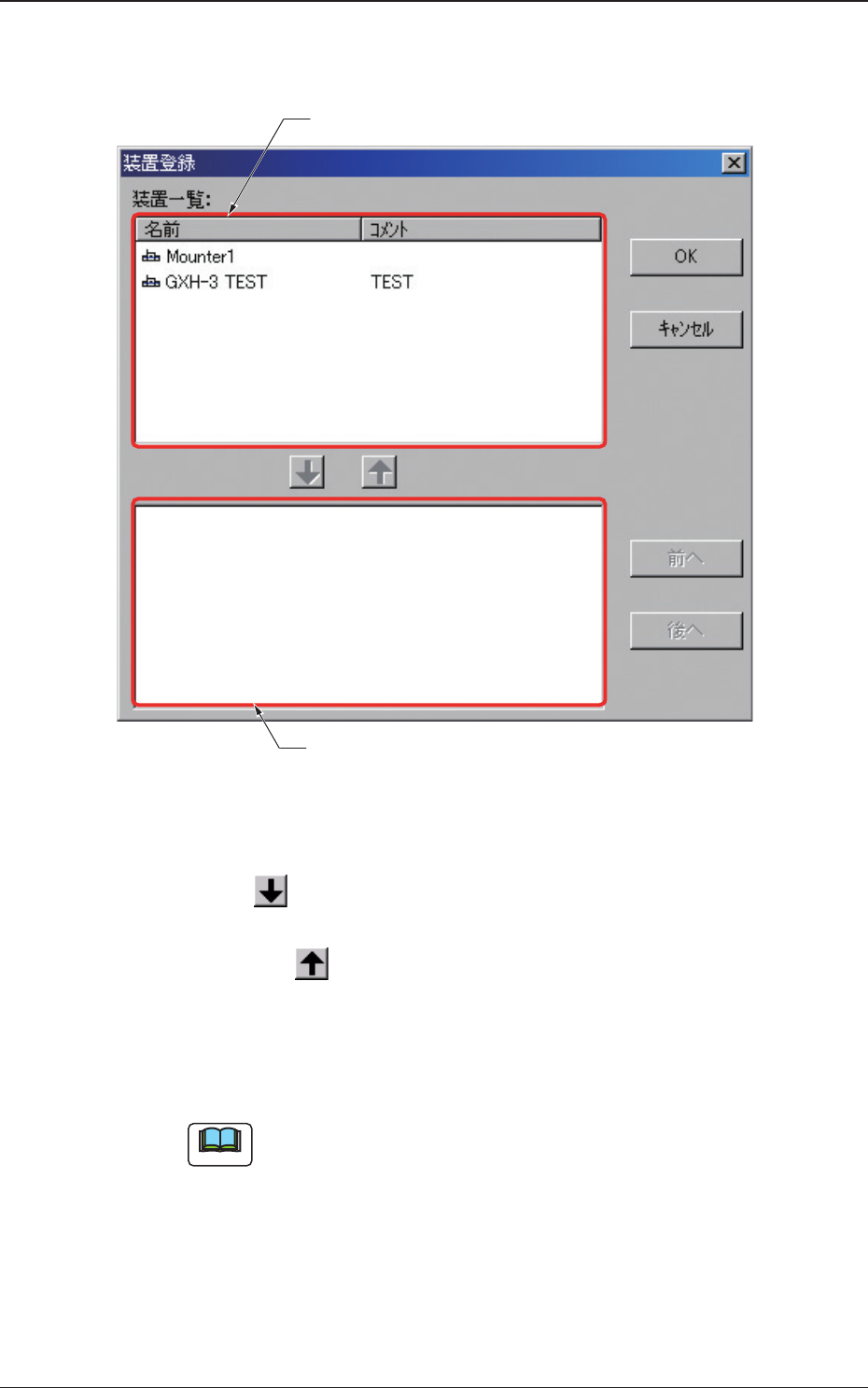 Tg0984-ID-OP 2-29 3.4新しいグループの登録 (3) [ 装置登録 ] ボタンを押します。 “装置登録”画面が開きます。 未登録の装置 登録した装置 Fig.B25 (4) “装置登録”画面でグループに登録する装置を選択し、 [ ] ボタンを押します。 グループから装置を削除する場合は、削除する装置を選択 し、[ ] ボタンを押します。 登録装置が決まったら、 [OK]ボタンを押します。 “…