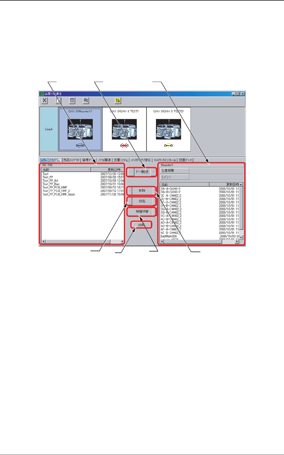 Tg0984-ID-OP 2-51 [5] [ 機種切替 ] ボタン “パターンプログラム一覧( 装置 )” で選択されているパターン プログラムで機種切替えを行います。 装置と接続されていない場合は表示されません。 [6] パターンプログラム一覧( 装置 ) 装置に保存されているパターンプログラムの一覧が表示されま す。 [7] [ 比較 ] ボタン このボタンを押すと、装置から受信したパターンプログラムと NT-…