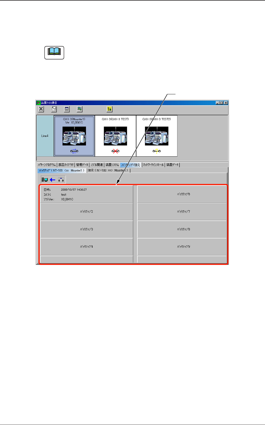 Tg0984-ID-OP 2-72 4.7装置データのバックアップ / 復元 4.7.1 装置データのバックアップ 装置から NT-100 にパターンプログラム、部品ライブラリデータ、シ ステムデータをバックアップする方法について説明します。 ノート バックアップは定期的に行うことを推奨します。 “バックアップ / 復元” タブシートで [ バックアップ ] タブを押すと、 以下のタブシートが表示されます。 [1] Fig.B…