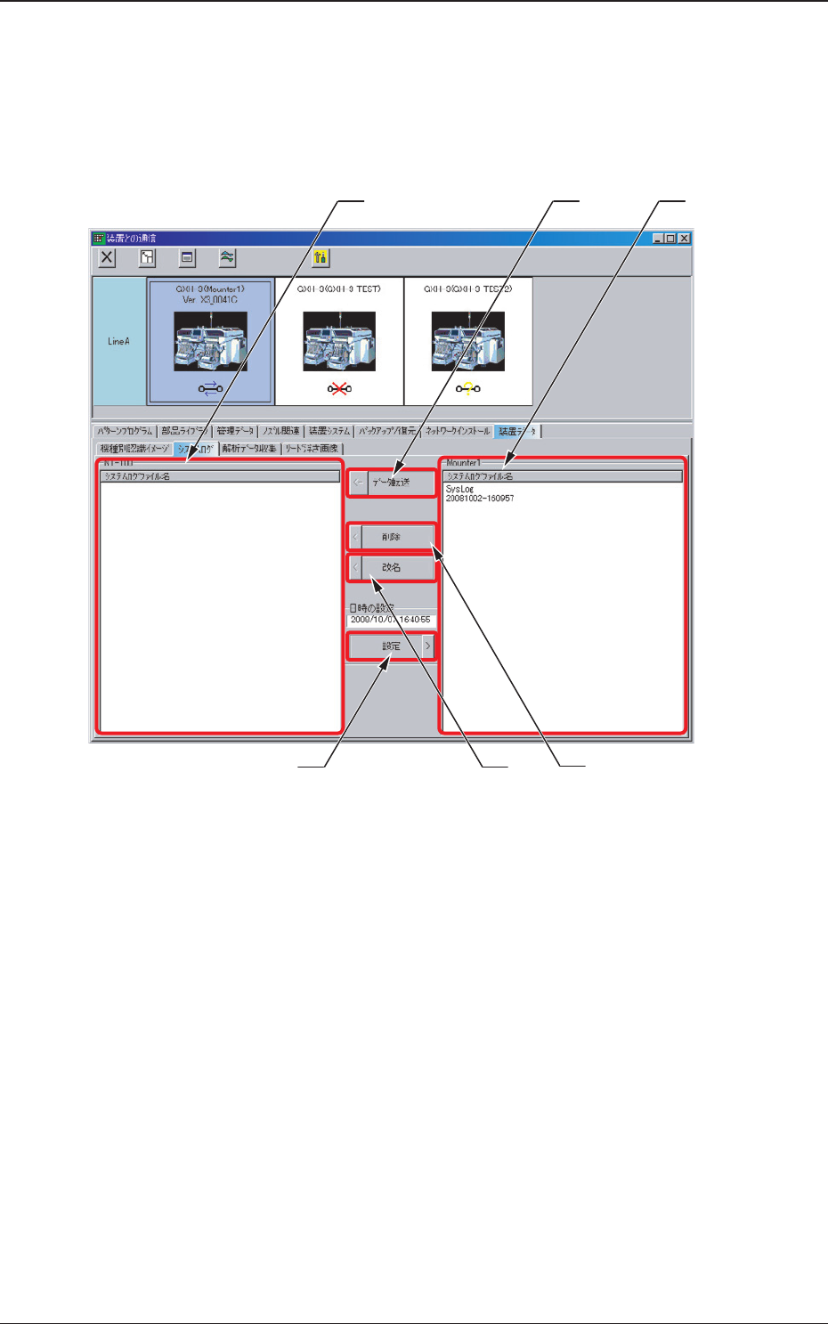Tg0984-ID-OP 2-77-2 4.9.2 システムログ システムログについて説明します。 NT-100 と装置を接続した状態で [ システムログ ] タブを押すと、以 下のタブシートが表示されます。 [1] [3] [2] [4] [5] [6] Fig.B66-2“システムログ”タブシート [1] 情報表示覧 NT-100 のシステムログファイル名が表示されます。 [2] 接続先装置情報表示覧 現在接続している装置…