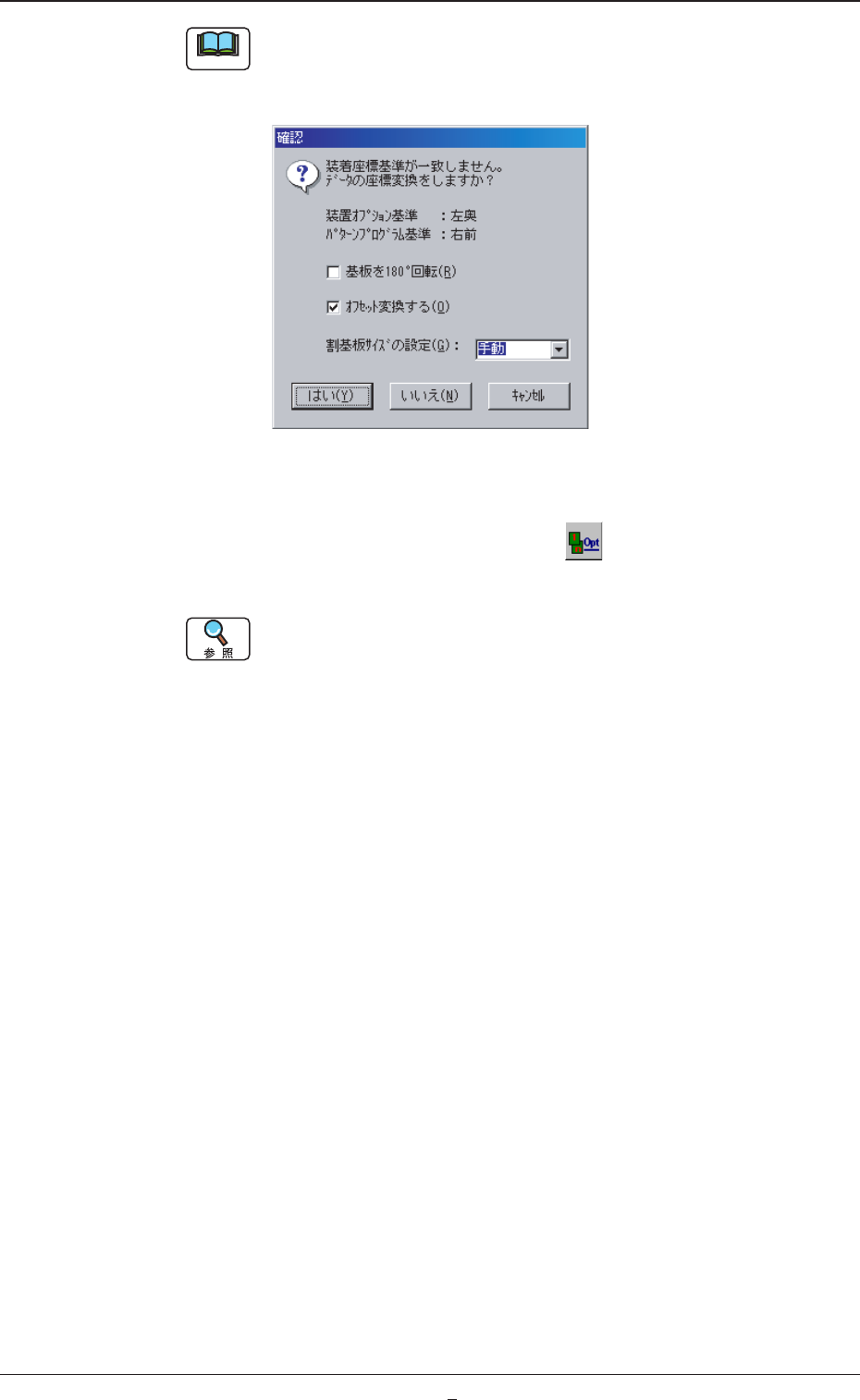 Tg0984-ID-OP 2-80-1 ノート パターンプログラムデータを編集する際、そのパターンプロ グラム基板位置決め基準と装着座標基準が異なる場合、以下 のような画面が表示されます。 Fig.B68-1 [4] [ 複数生産機種最適化ソフト ] アイコン ( ) 複数生産機種最適化ソフトが起動します。 詳細については、 “パターンプログラム最適化モジュール NT02006NT02007取扱説明書”を参照してください…