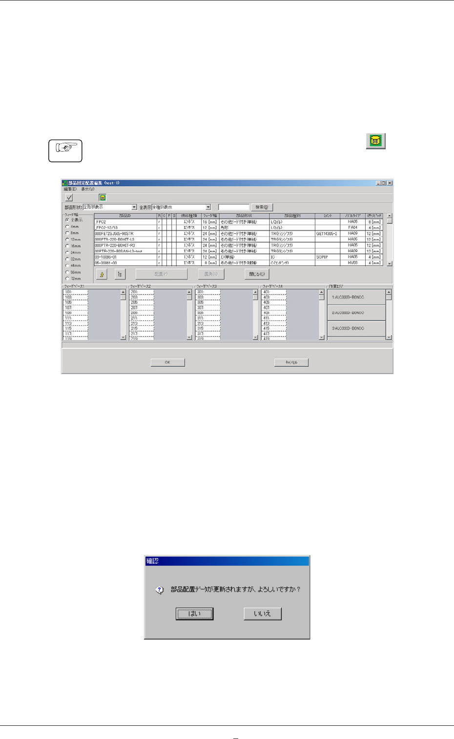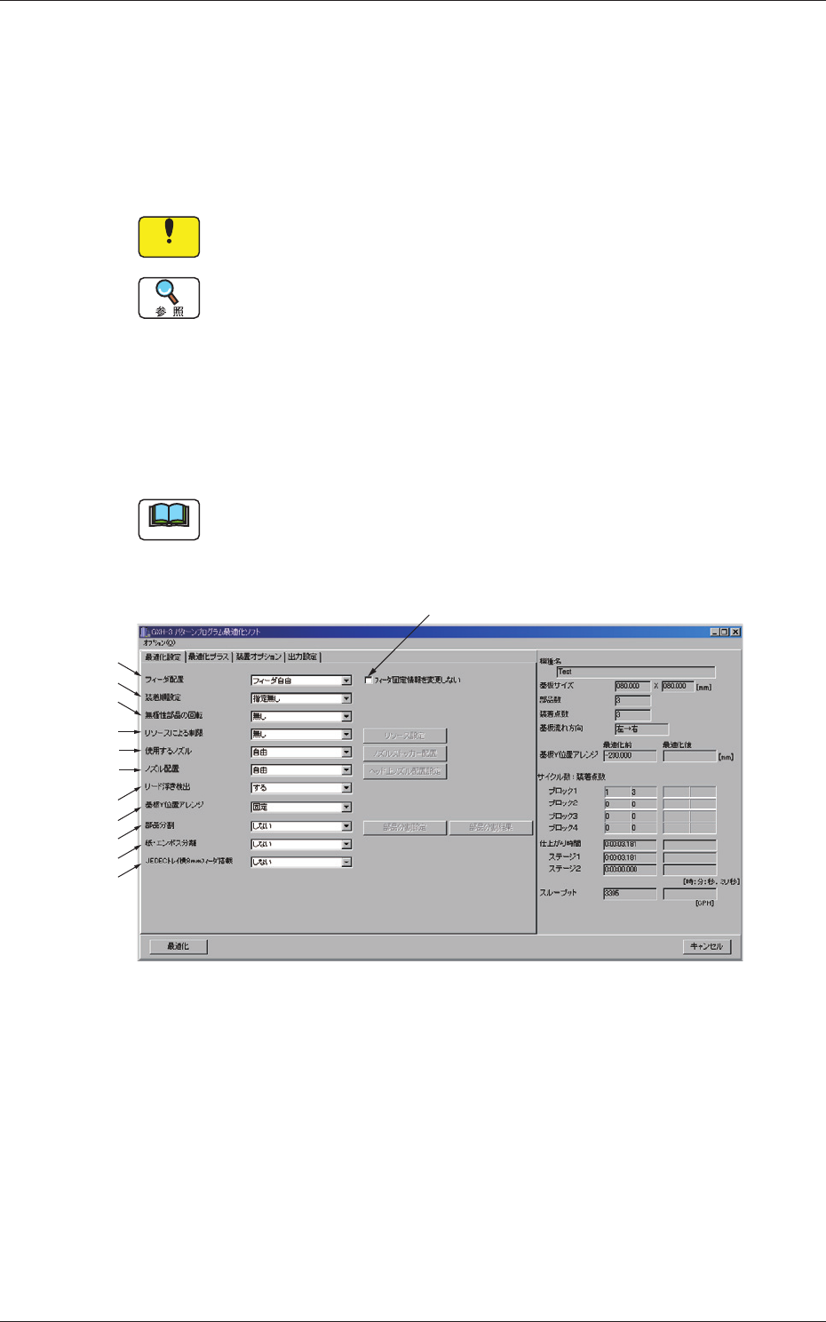 Tg0984-ID-OP 3-8 1.6 パターンプログラムの最適化 パターンプログラムの最適化を行い、生産効率を上げることができ ます。 また、吸着 ・ 装着順データを生成し、パターンプログラムシミュレー ションを行えるようにします。 注 意 最適化プラス機能を使用するにはライセンスが必要です。 ライセンスがない場合、項目を選択することができません。 最適化プラス機能については、“パターンプログラム最適化モ ジュー…