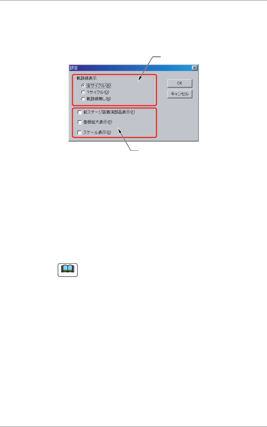 Tg0984-ID-OP 3-25-1 シミュレーションの詳細表示の設定 “パターンプログラムシミュレーション”詳細画面でメニューバーの [ 設定 ] を押します。  “設定”画面が表示されます。 [1] [2] Fig.C9 [1] 軌跡線表示 画面に表示する軌跡線の設定を行います。 全サイクル : すべてのサイクルの軌跡を表示します。 1 サイクル : 部品の装着か所のみを表示します。 軌跡線なし : 軌跡の表示を行…