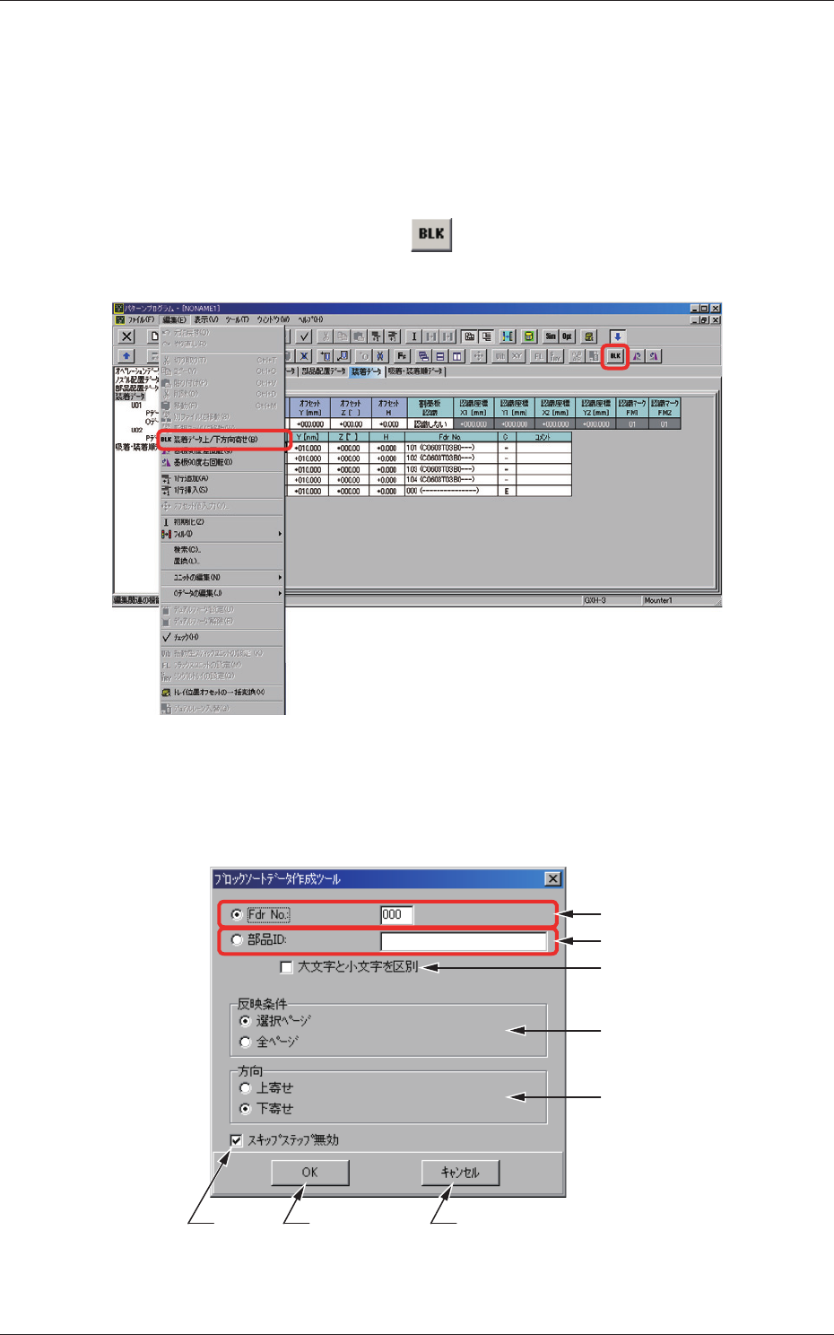 Tg0984-ID-OP 3-41-1 5.4 ブロックソートデータ作成 装着データステップの並びを特定の条件で並び替え、ブロック指定 を容易に行えるようにします。 パターンプログラムの“装着データ”編集画面で、[ 編集 ] メニュー の [ 装着データ上 / 下方向寄せ ] を選択するか、または [ 装着デー タ上 / 下方向寄せ ] アイコン ( ) を押すと、 “ブロックソートデー タ作成ツール”が表示されます。 Fig.C24…
