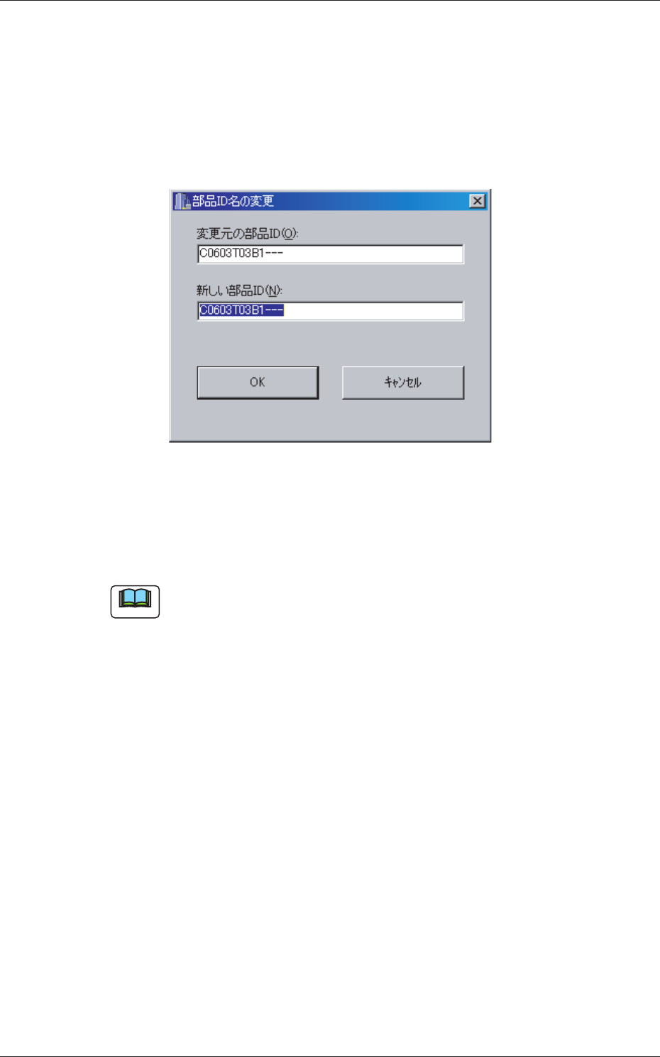Tg0984-ID-OP 4-14 2.4 部品 ID 名の変更 (1)部品 ID 名を変更したい部品 ID を選択します。 選択した部品 ID が青く表示されます。 (2) [ 名前の変更 ] ボタンを押します。 “部品 ID 名の変更”画面が表示されます。 Fig.D7“部品 ID 名の変更”画面 (3) “新しい部品 ID”に、新しい部品 ID 名を入力し、[OK] ボタンを 押します。 部品 ID 名が変更さ…