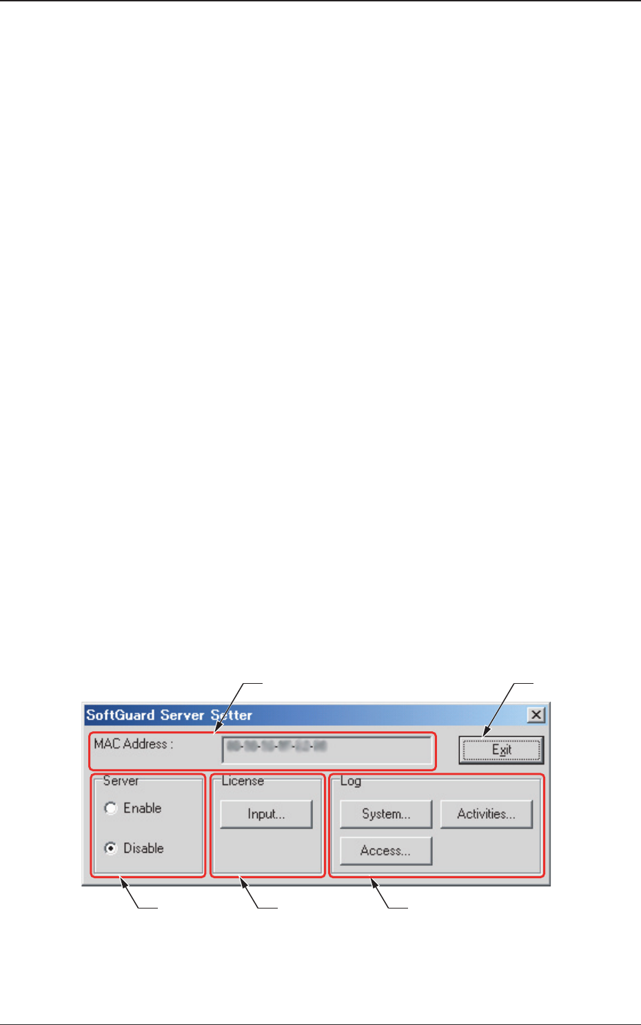 Tg0984-ID-OP 1-10 [1] MACAddress: パーソナルコンピュータの MACAddress が表示されます。  表示された値をライセンス判定に使用します。 [2] Server ライセンスサーバ機能の稼働状態を示します。  Enable : ライセンスサーバ機能有効( 稼働中 ) Disable : ライセンスサーバ機能無効( 停止中 ) [3] Licence[Input...]…