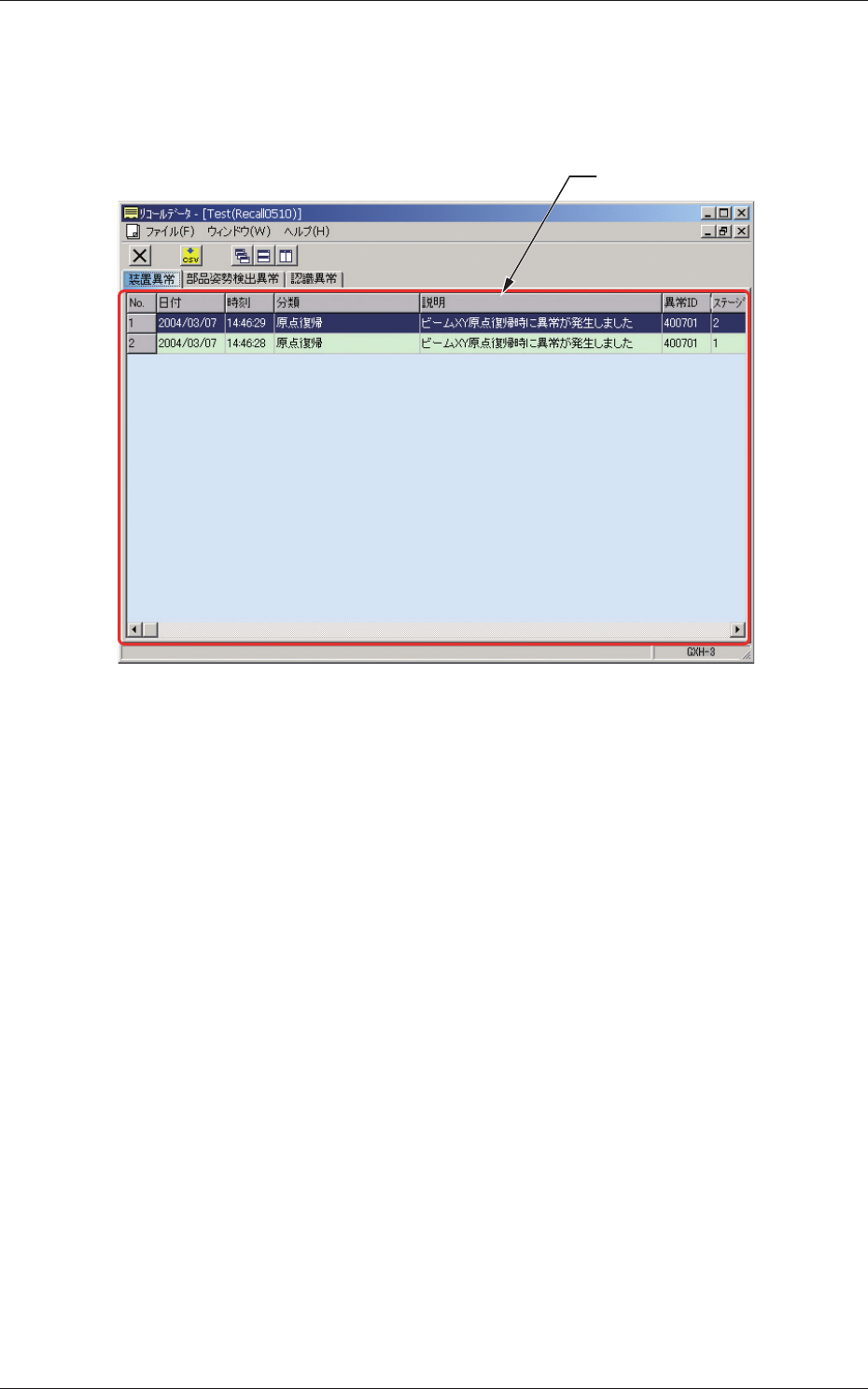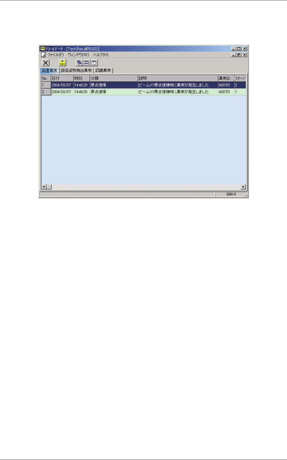 “リコールデータ”画面で、[ 装置異常 ] タブを押すと、以下のタブシー