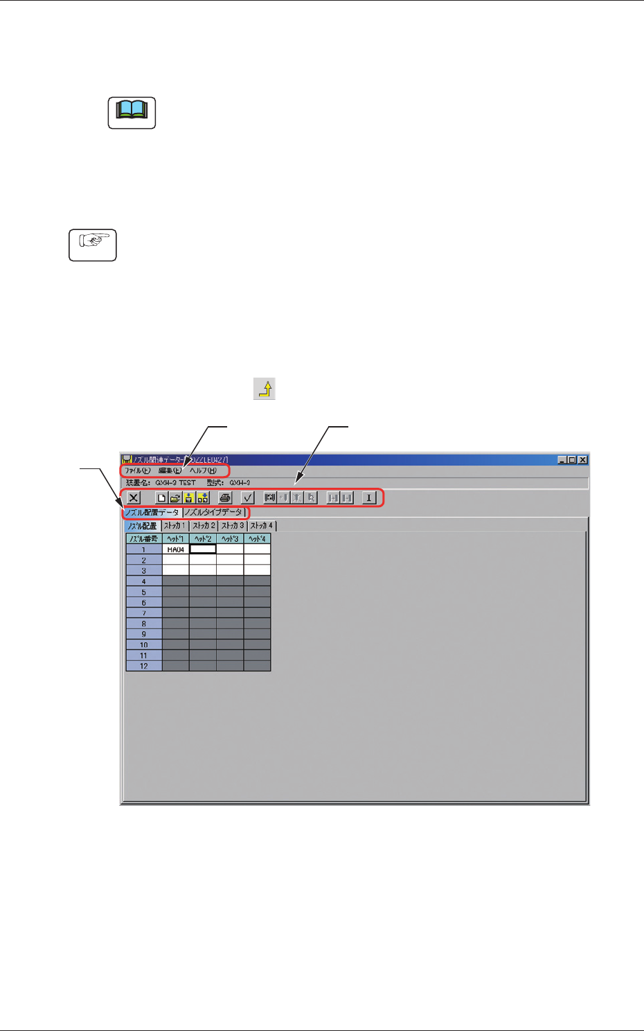 Tg0984-ID-OP 6-2 [2] ツールバー よく使われる機能がアイコンで表示されます。 [3] タブ 以下のタブが表示されます。 分類したメニューが並んでいます。 メニューを押すと、 そのメニューに含まれるコマンド の一覧がプルダウン表示されます。 ノズル配置データ “ノズル配置データ”タブシートが表示されます。 ノズルタイプデータ “ノズルタイプデータ”タブシートが表…