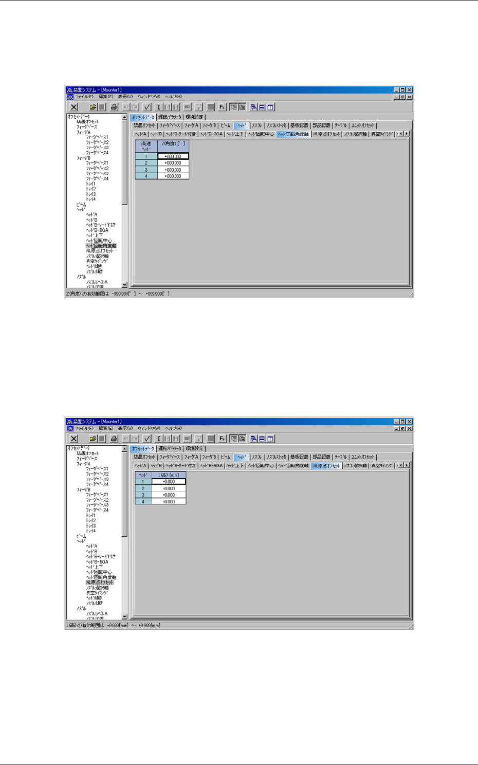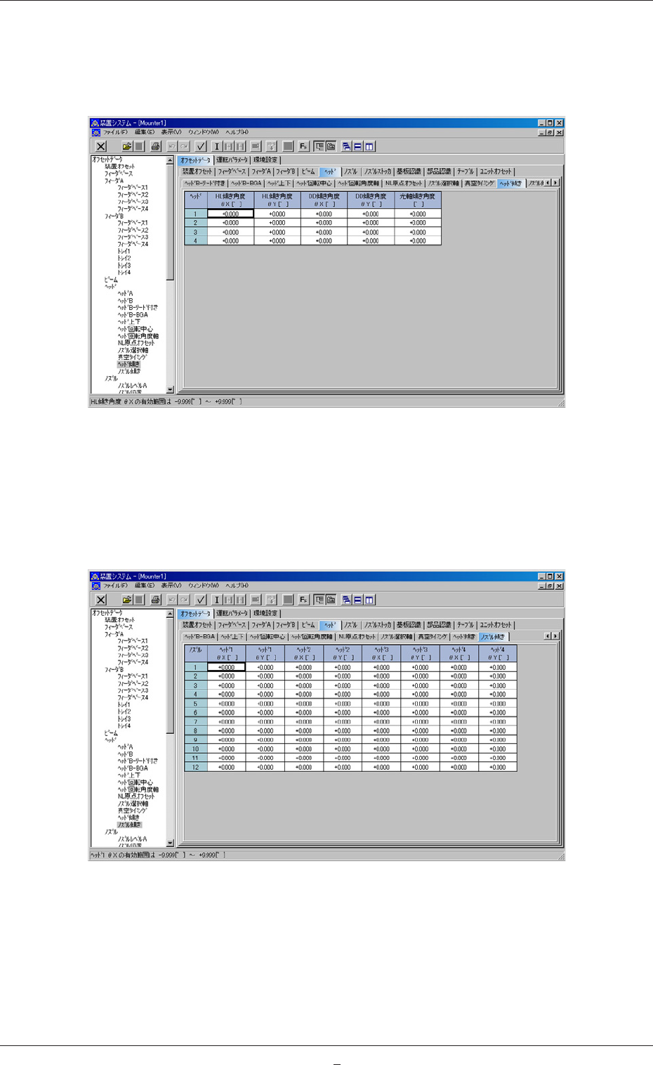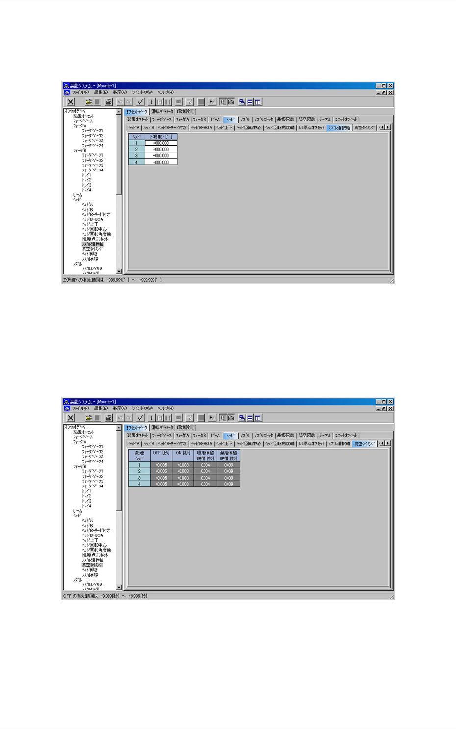 Tg0984-ID-OP 7-12 2.5.9 ノズル選択軸オフセット “ヘッド”タブシートの [ ノズル選択軸 ] タブを押すと、以下のタブ シートが表示されます。 Fig.G12“ノズル選択軸”タブシート 2.5.10 真空タイミングオフセット “ヘッド”タブシートの [ 真空タイミング ] タブを押すと、以下のタ ブシートが表示されます。 Fig.G13“真空タイミング”タブシート 2.5ヘッドオフセット 081 1…