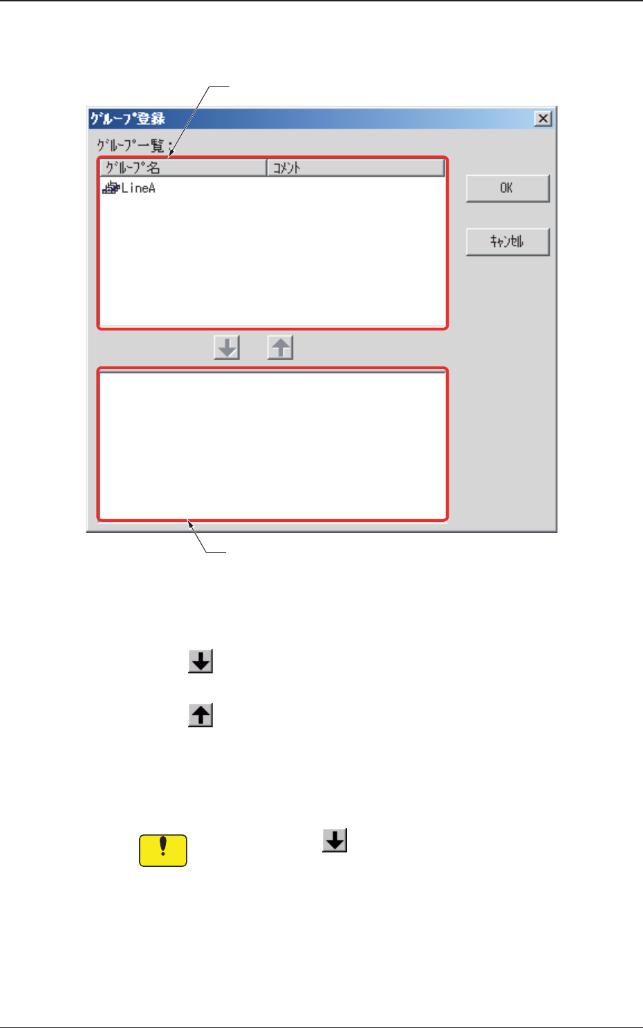 Tg0984-ID-OP 2-26 3.3新しい装置の登録 (3) [ グループ登録 ] ボタンを押すと、以下の画面が表示され ます。 未登録のグループ 登録したグループ Fig.B20“グループ登録”画面 (4) “グループ登録”画面で登録するグループを選択し、 [ ] ボタンを押します。 グループを削除する場合は、削除するグループを選択し、 [ ] ボタンを押します。 登録グループが決まったら [OK] ボタ…