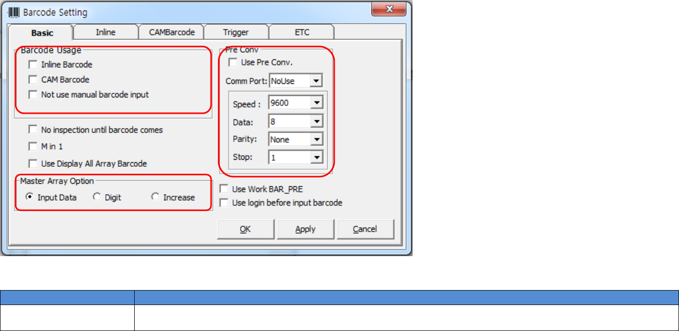 • CAM Barcode: Select this to use the Cam Barc ode Reader . • Not Use Manual Barcode Input: Select this not to pop -up manual Barc ode Input windo w when barcode recognition is failed. 2. No inspection until barcode come…