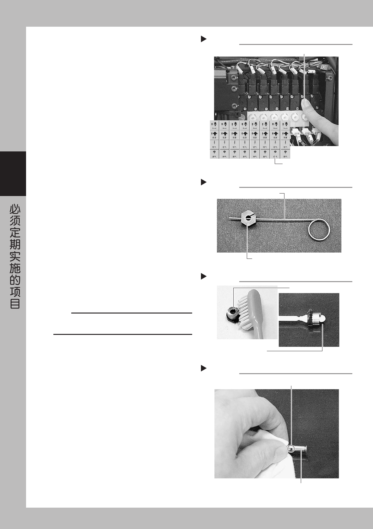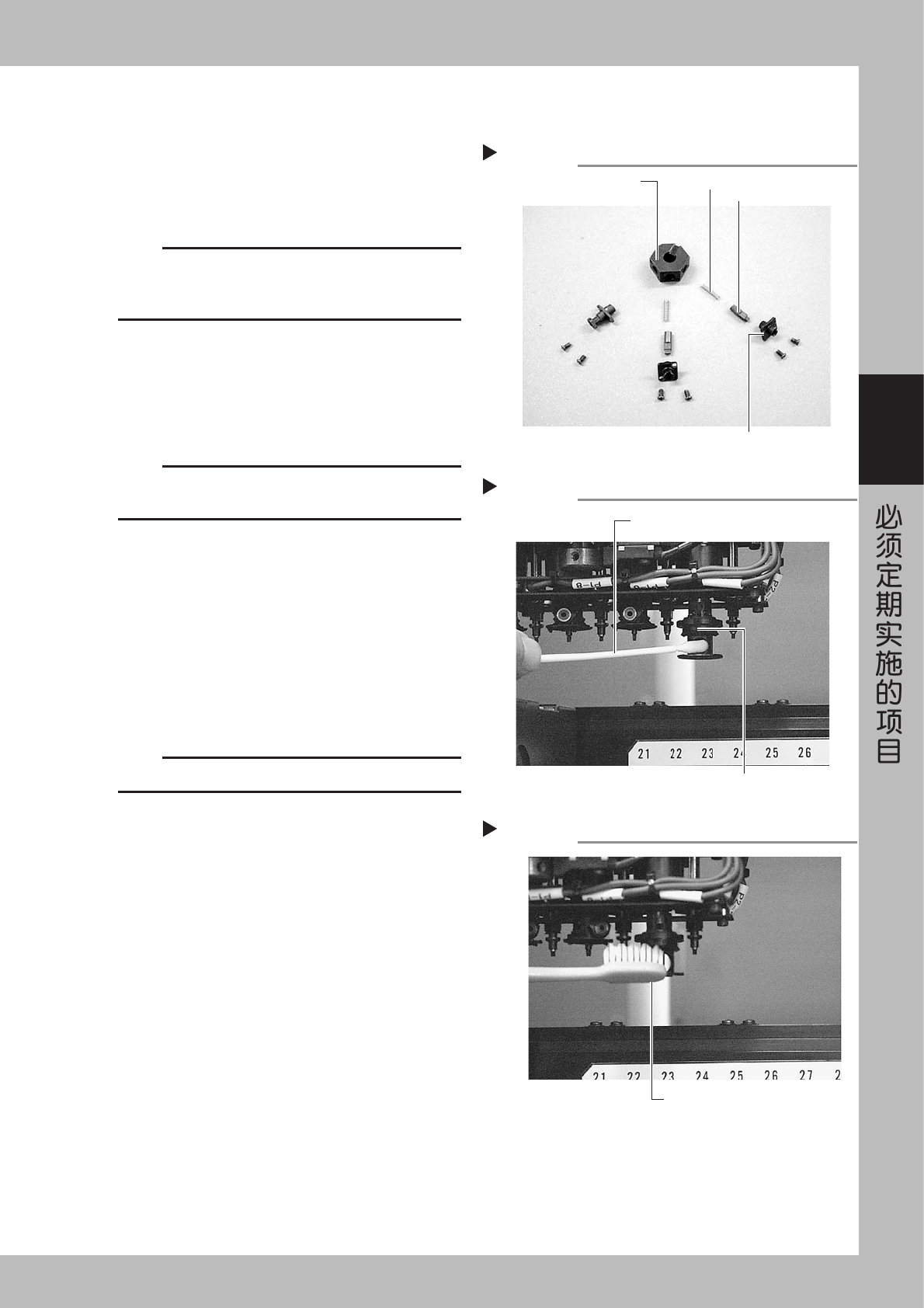 3-6 3 4 实 施 气 排 屑 清 洁 齿 键 轴 内 部 。 请 用 手 按 住 排 出 器 阀 的 排 气 孔 的 同 时 , 按 [ 装 置 ] - 「 H e a d 」 图 标 画 面 的 [ 排 气 ] 按 钮 , 对 齿 键 轴 内 部 实 施 气 排 屑 。 55 3 12 - E0 -0 0 5 请 从 酒 精 容 器 中 取 出 浸 渍 的 零 件 并 清 洗 。 1 . 请 用 针 状 穿 孔 器 等 清 洁 …