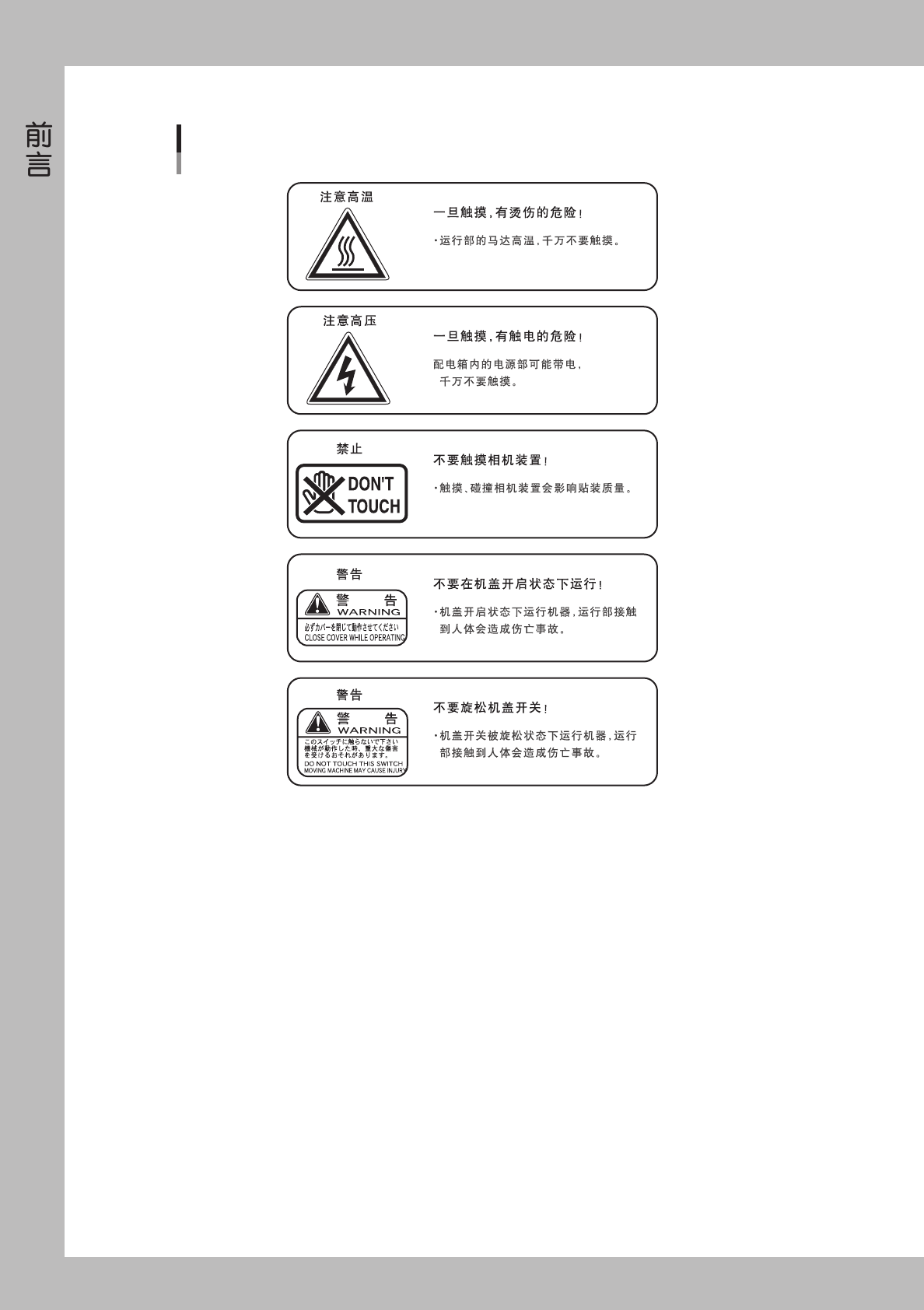 ■ 机器上贴有下列警告标贴,必须确认标贴内容无条件服从标贴中的指示。