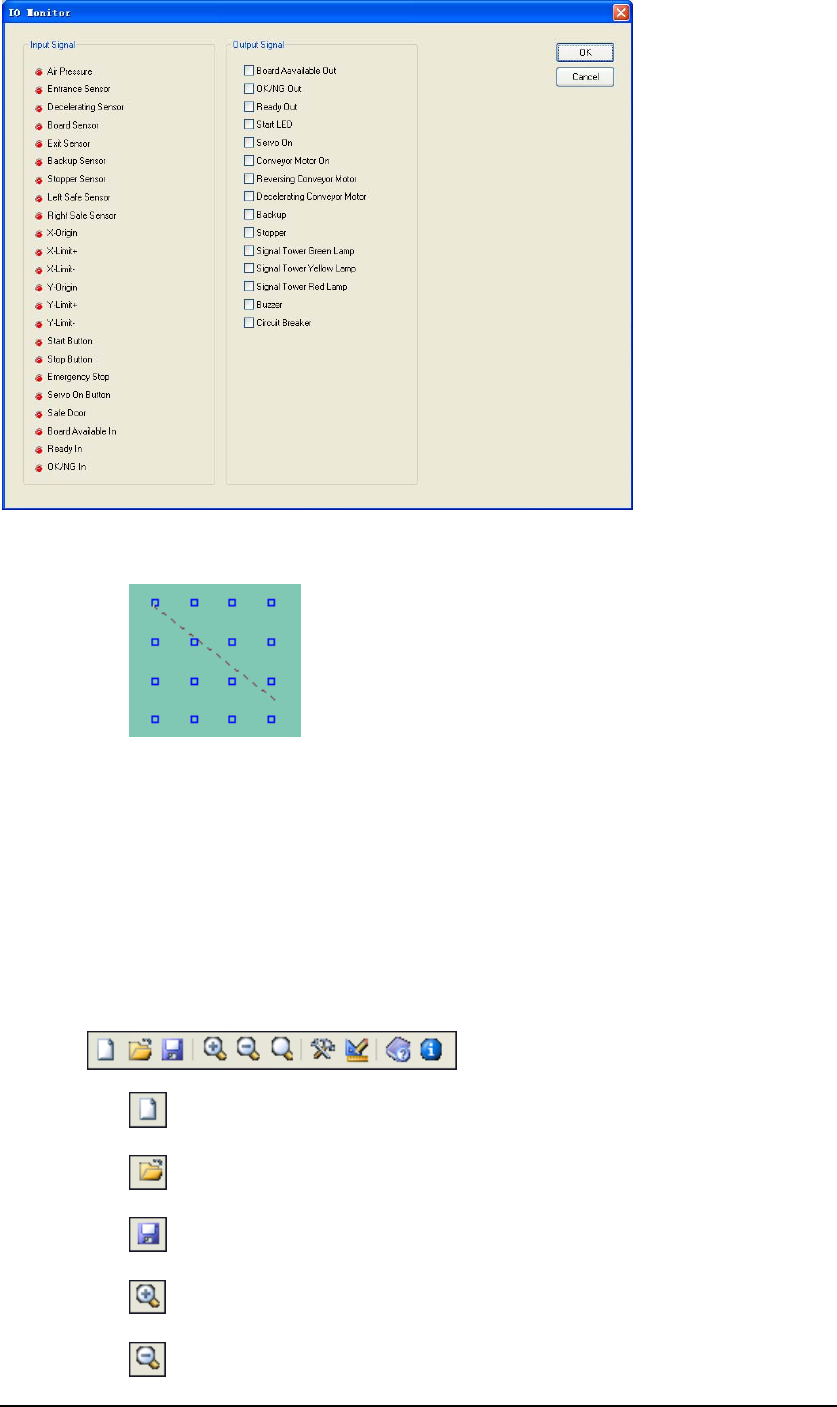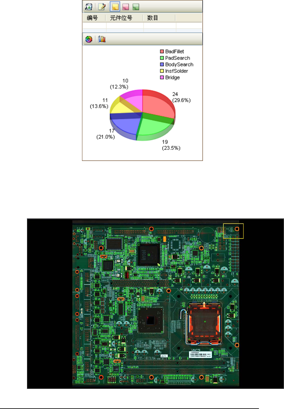 缩放至最适屏幕 等同于选项菜单 测量距离的工具 帮助信息 版本信息 5.1.2 状态区 该区域实时显示设备状态及检查状态。 5.1.3 基板信息区 该区域显示程序名称、PCBA 尺寸、元件数量、 生产基板数、不良基板数、不良元 件数、直通率、CYCLE TIME、桌上机专用的 X OFFSET,Y OFFSET(PCB 放置在进口 处使用)等。 30