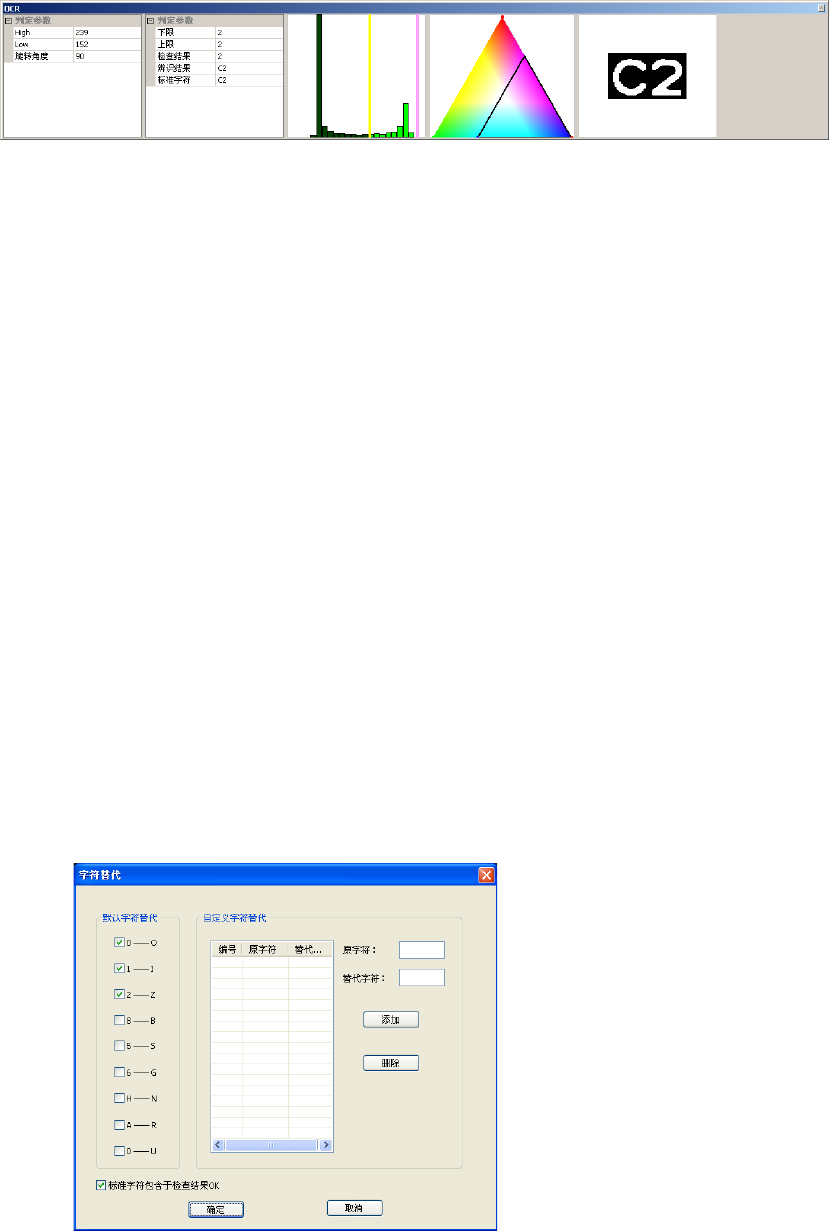 OCR 计算参数: 亮度参数(可用 鼠标通过直方图 来设定) : a) 亮度上限( High ) :设定最高亮 度值( 0~255 ) b) 亮度下限( Low ) :设定最低亮度 值( 0~255 ) 颜色参数(可用 鼠标通过色彩图 来设定) : c) 红色上限:设定 红色最大值( 0~173 ) d) 红色下限:设定 红色最小值( 0~173 ) e) 绿色上限:设定 绿色最大值( 0~173 ) f) 绿色下限:设定 绿色最小值(…