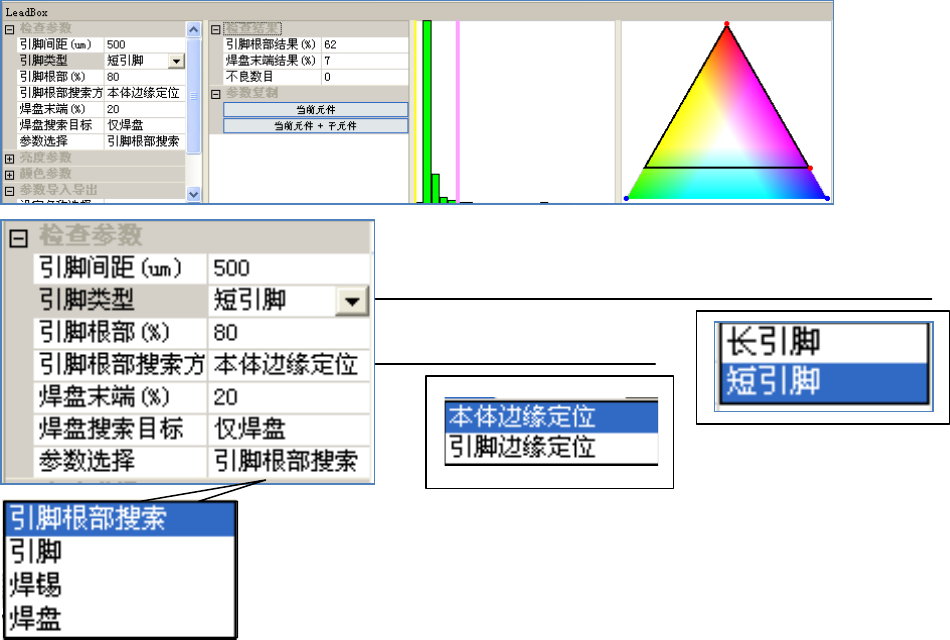 ImageMatch 图像获取方法: a) 取窗口: 按照 设定检查窗 口大小获取参考 图像(目标图片 大小) b) 取模板:在检查 窗口内搜寻和参 考图像最接近 图像, c) 旋转模板:以原 有模板为基础, 调整参考图像 的角度 判定参数: a) 百分比上限:实 际获取到的图像 和参考图像进 行相似度比对( 0-100 ) b) 百分比下限:实 际获取到的图像 和参考图像进 行相似度比对( 0-100 ) 检查结果:结果 符合上限和下…