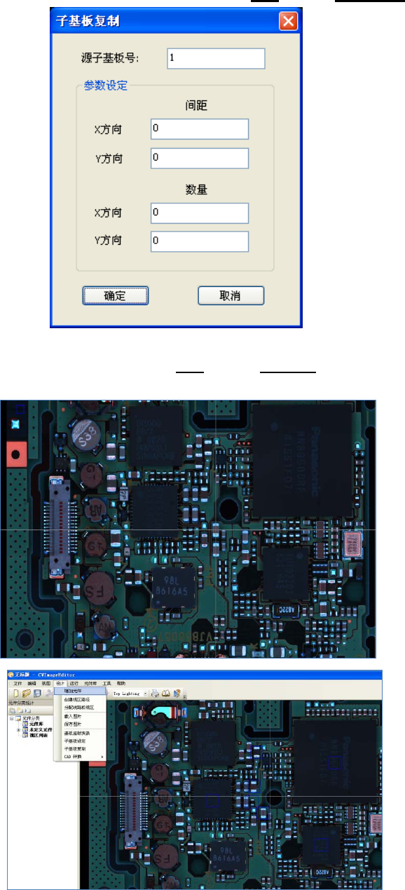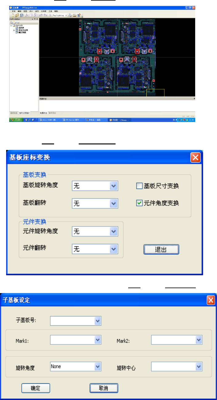 4 , 载入已有图像 ,选择设计菜单栏下载 入图片 5 , 导入图像 后, 确认图像和 CAD 数据是否相吻合 , 如果 元件或是基板需要作 角度, 镜像, 翻转 ;可以选择 设计菜单栏下 基板坐标变换 6 , 需要对拼板中其中一个进行 单板设定 ,可以选择设计菜单栏下子 基板设定