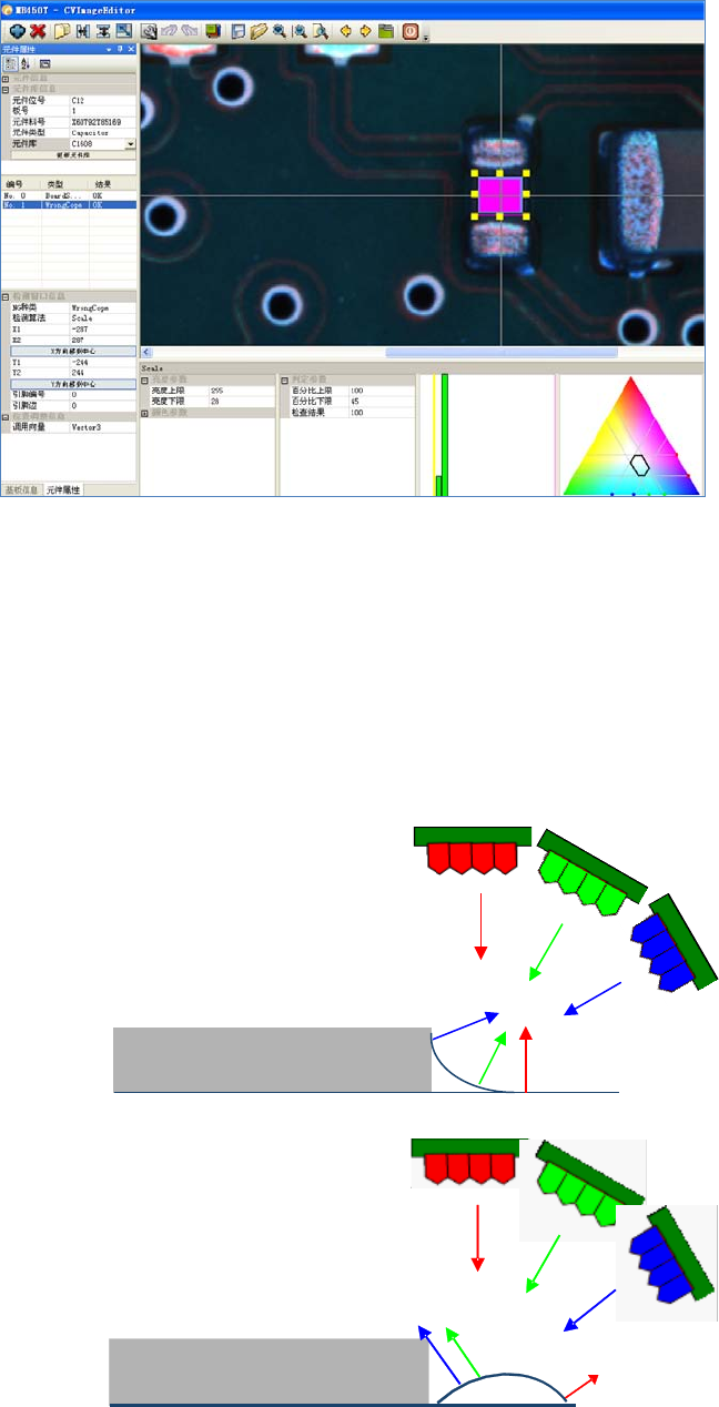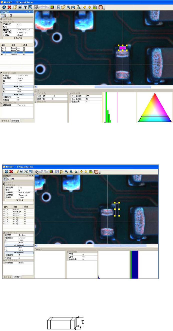 (二):电容错电阻 可以通过亮度或是抽 取颜色来进行判定, (三) : 电 容错电感 基本上 和电容错电容情 形相同; 我们着重以 第二种情形为 主进行介绍 新增加一个窗口 --- 选择 NG 种类( W rongCom p ) --- 调整窗口大小 (考虑到元件 本身的尺寸 亮度 颜色 变异;实际 设定窗口应比 特征位置要小) --- 选择算法 ( Sca le ) --- 选择需要调用 的向 量( Vector3 ) --- 抽取窗…