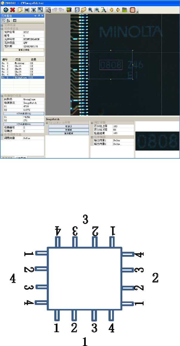 ( 4 ) 偏移 是可以量 化的一个检查 项目, 新增窗口 --- 选择 NG 种 类( Sh ift ) --- 选择算法 ( Scale ) --- 调整窗口大小 并放置在适当 的 位置 -- 抽取窗口内的亮度和 彩度 -- 设定判定阀 值 -- 激活窗口列表 中 Shift 窗口作 X/Y/ 对角复制 ( 5 ) 错件 采用的算 法 : 主要有 OCR 和 ImageMat ch