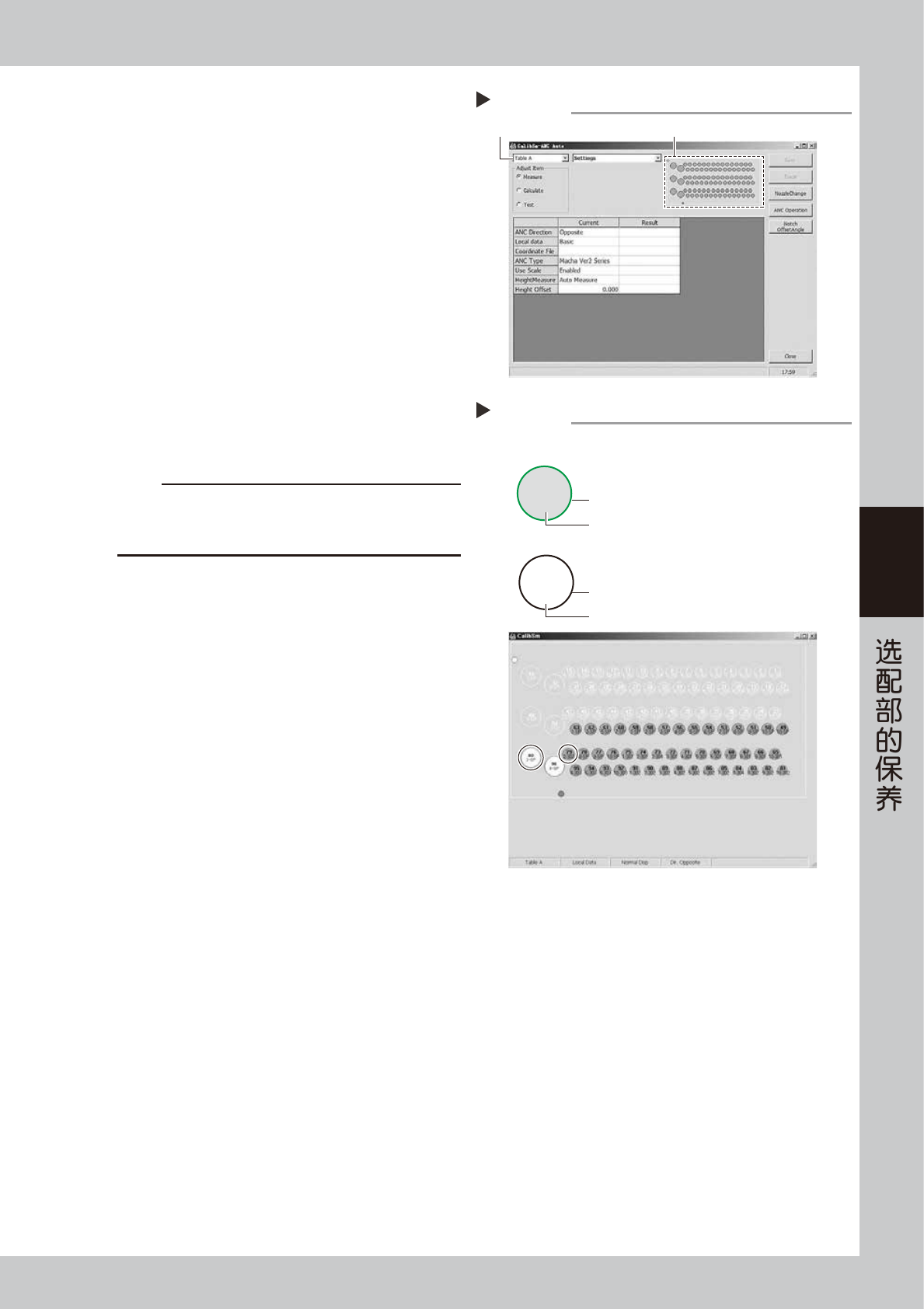 4-5 4 5 打开确认传感器的画面。 1. 从“CalibSm-ANC Auto”画面左上的下拉框中 选择任意的工作台。 2. 按吸嘴交换站的示意图按钮,打开确认传感器 的画面。 56403-L4-00 6 确认传感器的状态。 1. 参考右图的说明,确认画面中显示的吸嘴放置 状态是否与实际的吸嘴放置状态相同。 2. 用手取出吸嘴,确认对象位置的显示已变为无 吸嘴。 56404-L4-00 7 清洁吸嘴交换站。 若画面的显示与实际不一致…