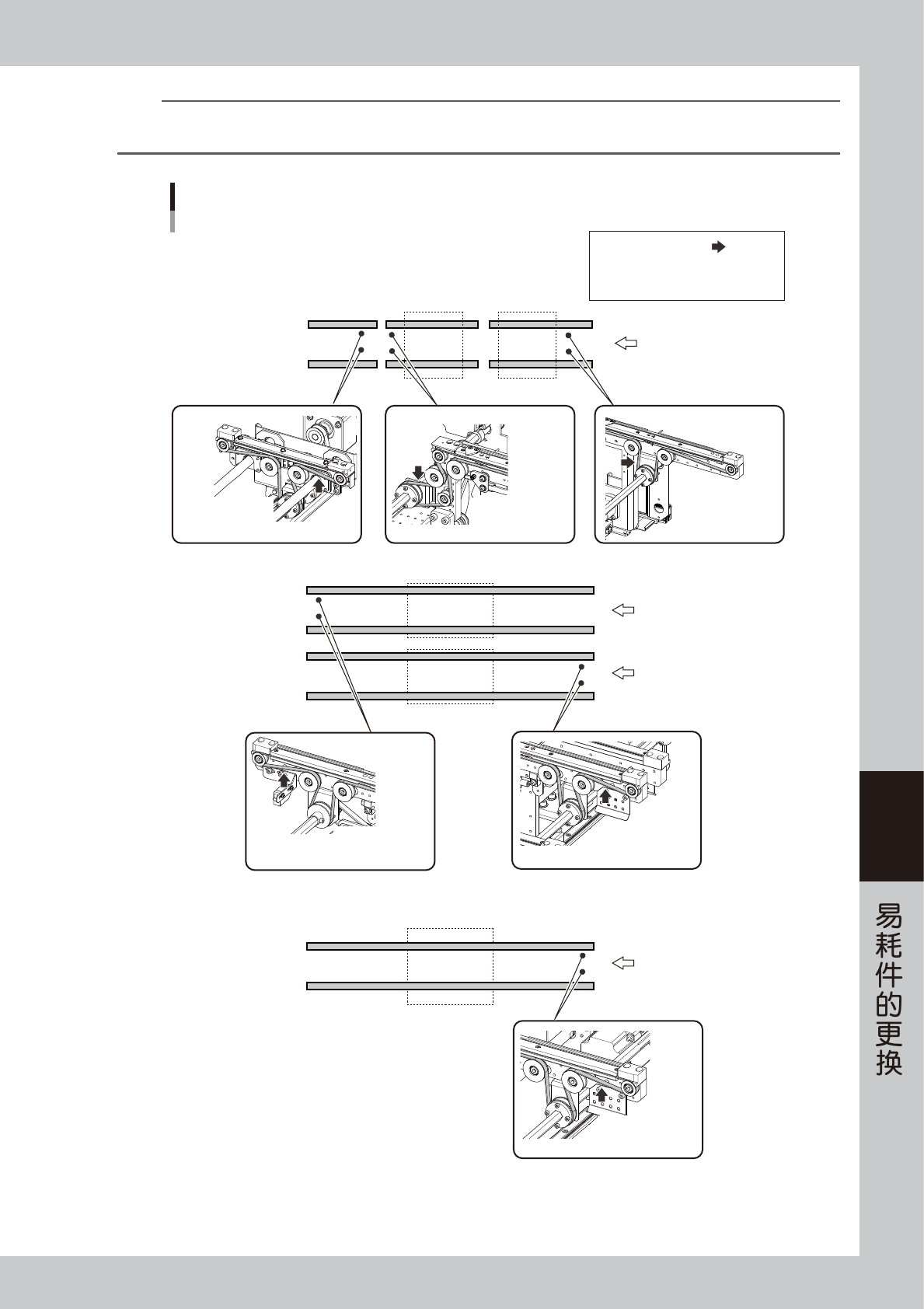 6-12 6 7 拆出传送带。 将传送带从六角轴与驱动用带轮之间空出的空隙中 取出。 55625-L4-00 8 清洁传送带导轨部与带轮。 1. 用吸尘工具 ( 选购件 ) 清除传送带导轨与传感 器等部位粘附的传送带磨损粉。 2. 带轮表面若有传送带的磨损粉变黑固着时,可 用塑料刮片等除去。 3. 若用吸尘工具无法完全清除传送带导轨部粘附 的磨损粉时,可用塑料软刷等清除。 55626-L4-00 c 注意 刮片与软刷请使用塑料制品,以免…