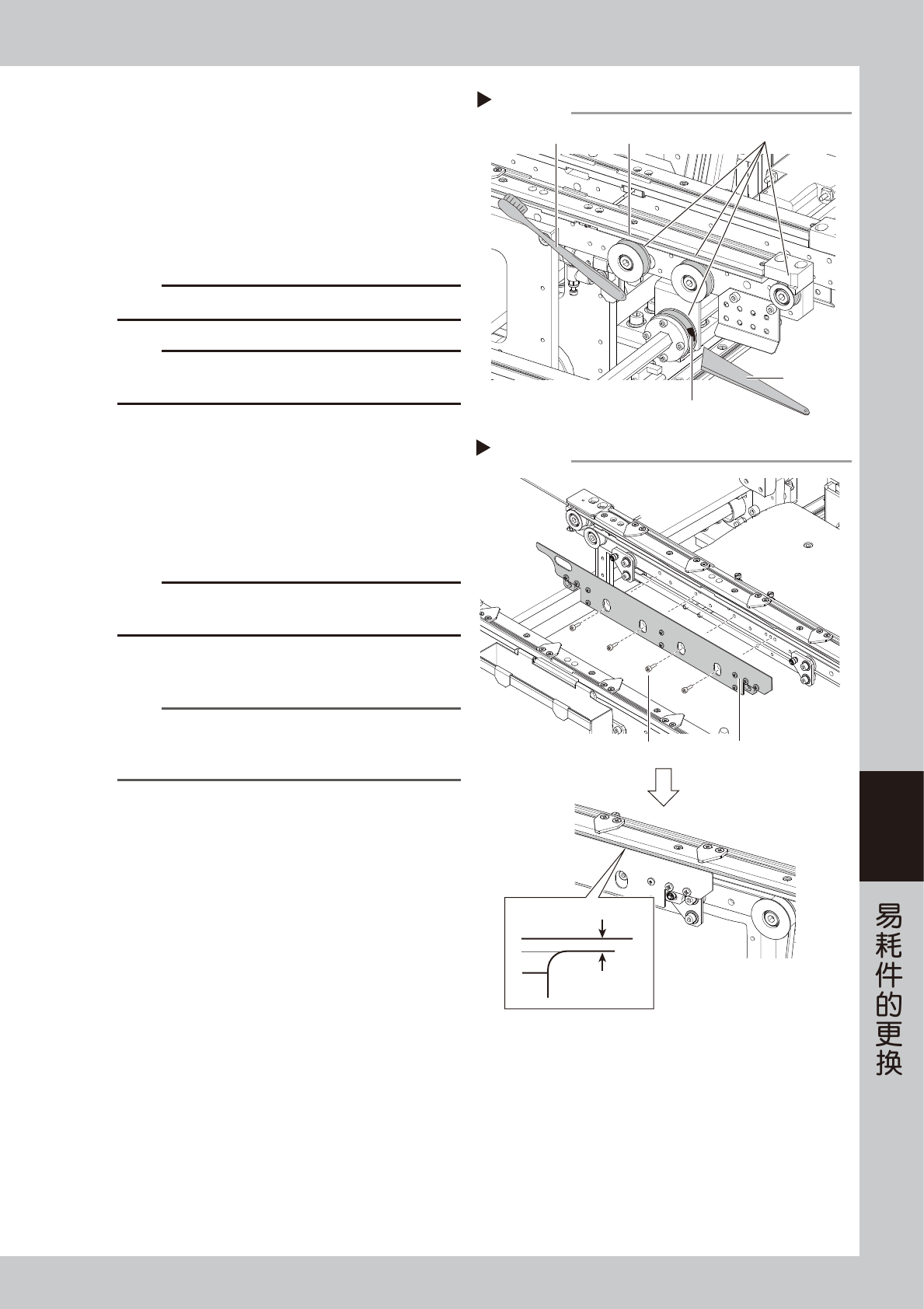 6-18 6 r 确认传送带的安装状态。 1. 确认基板固定夹顶面的位置是否在低于传送带 传送面约 0.5mm 的位置。 2. 关闭贴片机的机盖,解除紧急停机状态。 使用一次性换料车的机型,需将料车安装在贴 片机上。 3. 按 [ 装置 ] - “传送装置” 画面的传送带驱动按钮, 使传送带转动,确认传送带的转动状态。 4. 若传送带的转动不顺畅或过于挠曲时,需调节 施加张力的带轮 ( 双段传送台机型的出口传送 段为带轮托架 ) 的位置…