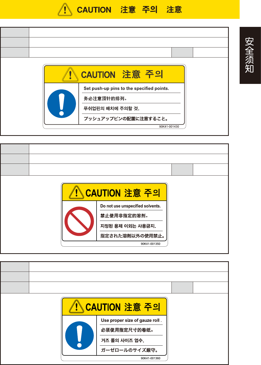 xxii 3.3 注意标示 3.3.1 使机械受损 危险结果 有影响贴装精度的危险。 安全防范 请勿触摸或碰撞相机装置。 对象 所有设备 警告阶段 生产准备 维修保养 危险结果 有损坏的危险。 安全防范 使用之前,务必拆除搬运用的螺栓。 对象 送料器一次性换料车 ( 选配 ) 警告阶段 设备安装 危险结果 有导致设备受损以及动作不良的危险。 安全防范 务必与指定的电压连接。 对象 所有设备 警告阶段 设备安装 以连接…