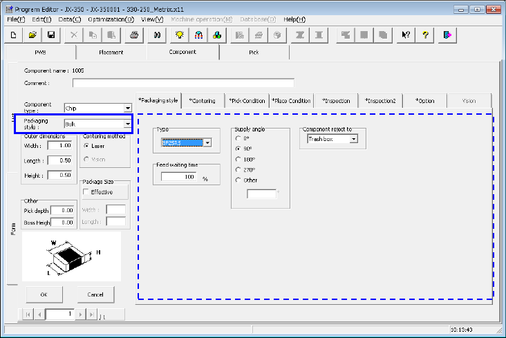 EPU Instruction M anual C hapter 4 Creating a Production Progr am 4- 62 (4) How to enter data if you select “ Bulk ” as the “ Packag ing style ” 1) Ty p e Set the bulk f eeder type. 2) Feed w ait ing tim e Set the ratio …