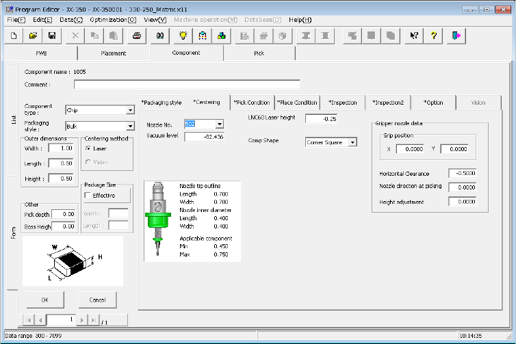 Set "Nozzle No.", "Component pick vacuum pressure", "LNC60 laser height",