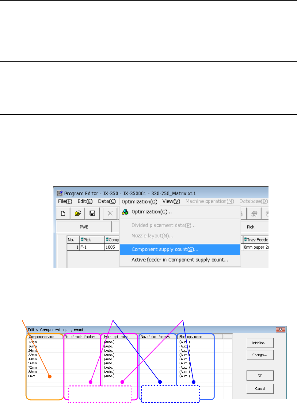 ① Click the [Optimization]/[Component supply count] commands from the menu bar.