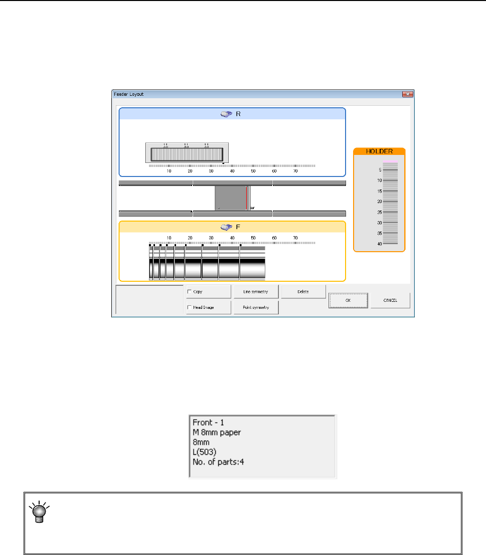 The [Feeder layout] command displays the feeder layout specified on the “Pick” data