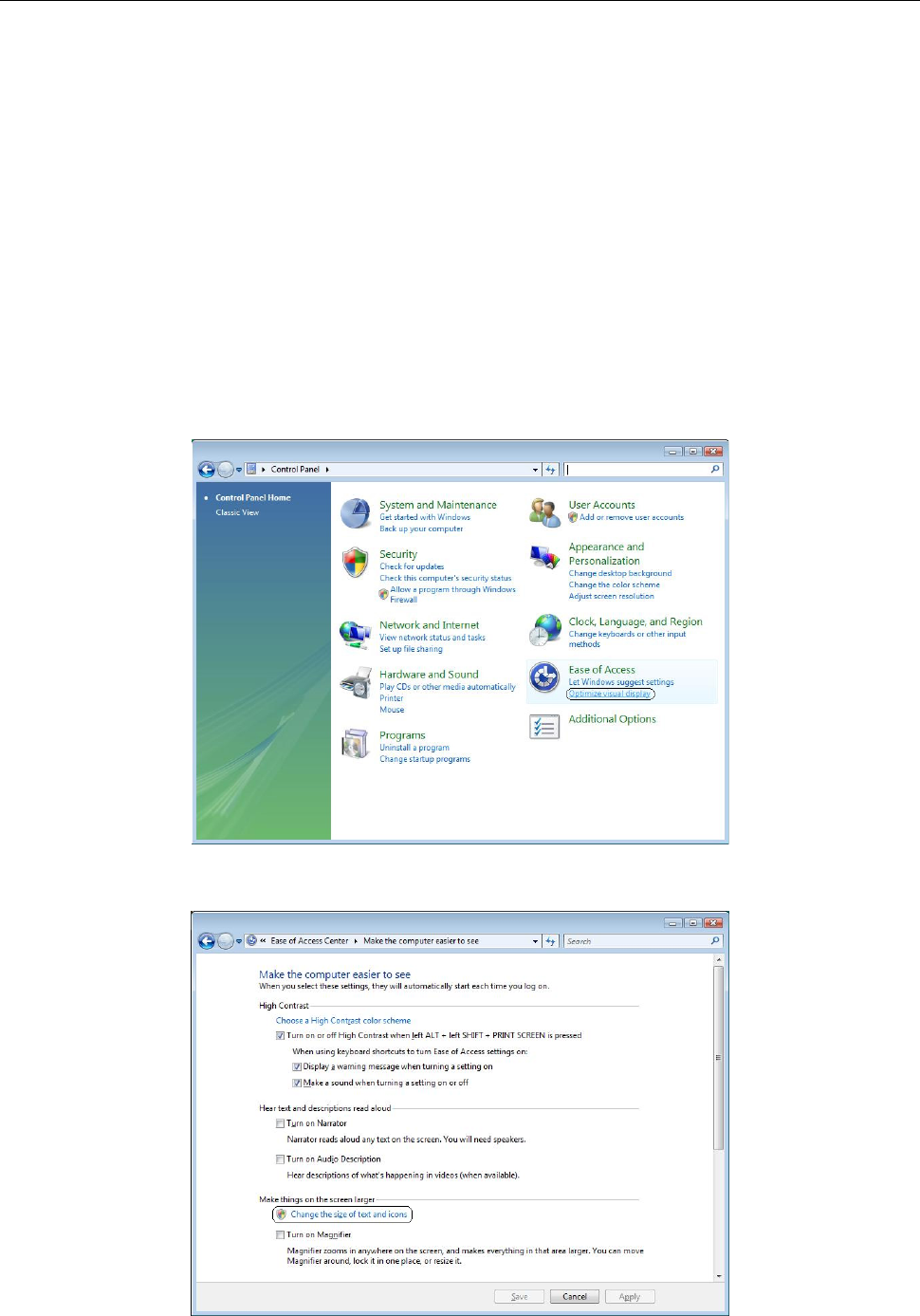 ① From the control panel select [Ease of Access] - [Optimize visual display].