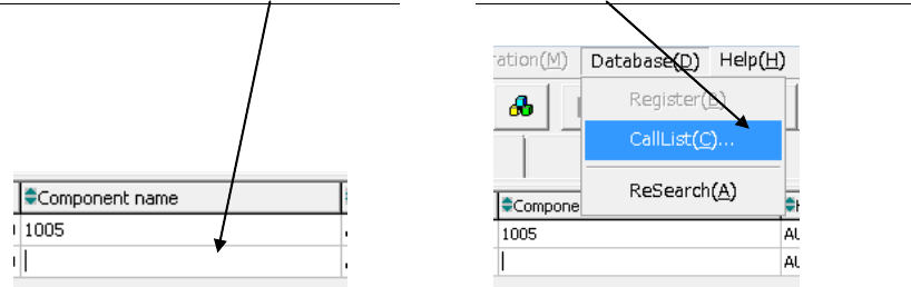 ① Click a blank “Component name” field. ② Click the [Database]/[CallList] commands.