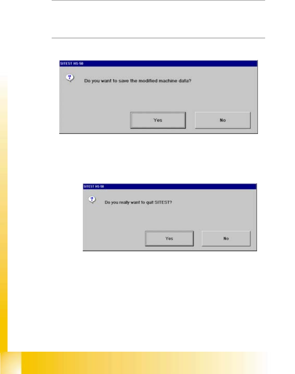06/2002 E dition Studen t Guide H S-50 Advance d I 6 Operati ng the S IT ES T Softwa r e 4 NOTE If newly dete r mine d o r edited machine data have not been saved yet, an appropriate mes- sage will be d isplayed before e…