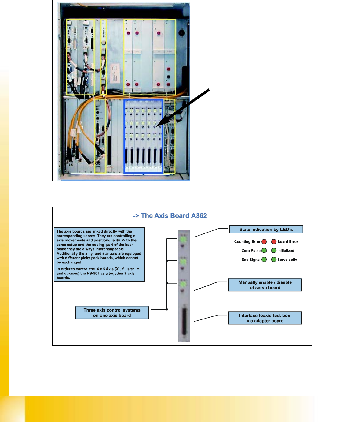 06/2002 E dition Studen t Guide H S-50 Advance d I 2 Ov erview 14 2.2. 5 Axes B oar d s A362 F ig. 2. 2 - 7 Co ntr ol c ag e, A xes boa rds F ig. 2. 2 - 8 A xi s Boa rd A36 2 The controller for the i ndividual axes is l …