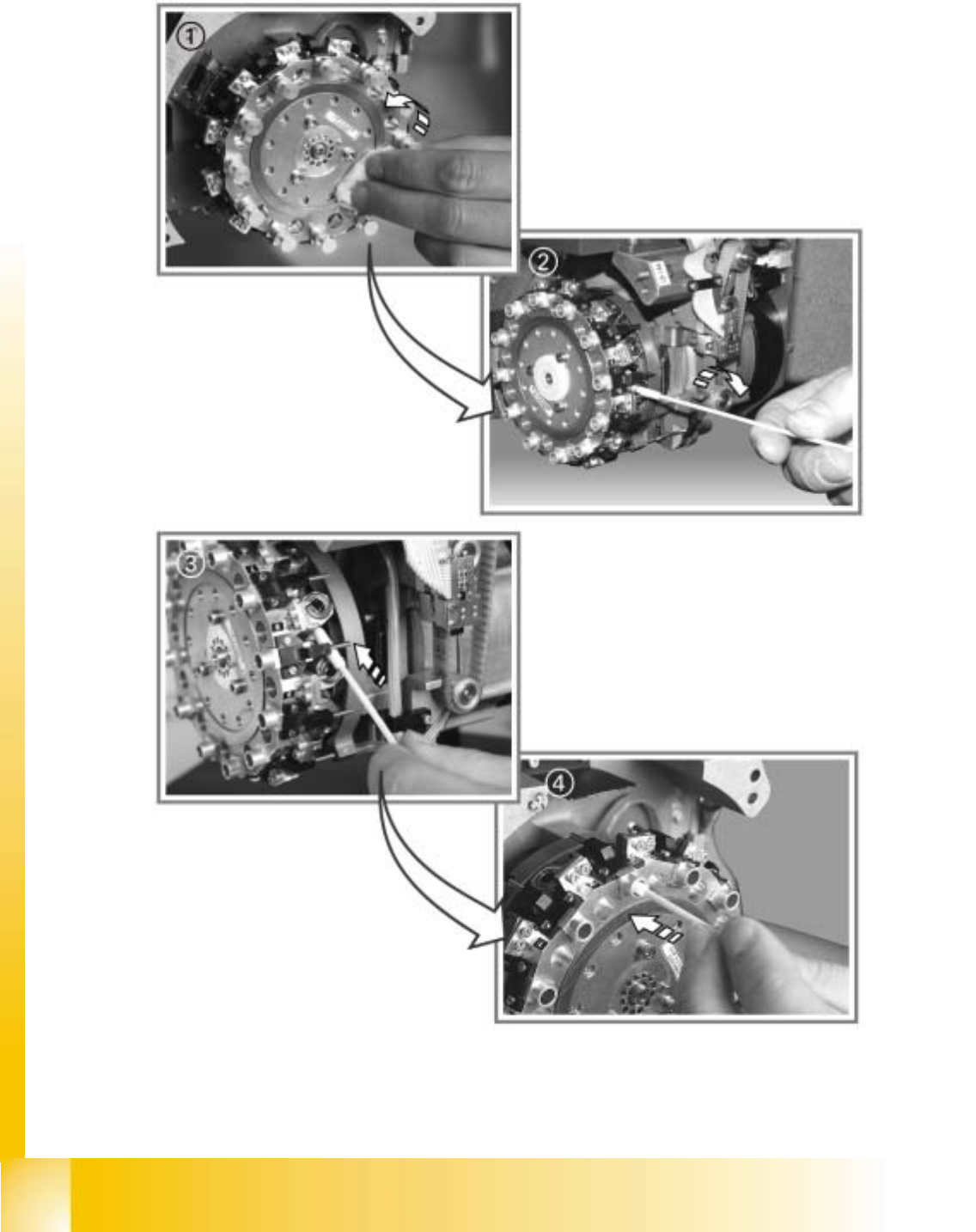 : Clean the rollers, cogs and the toothed belt using a cottonwool bud or lint-free cloth moistened