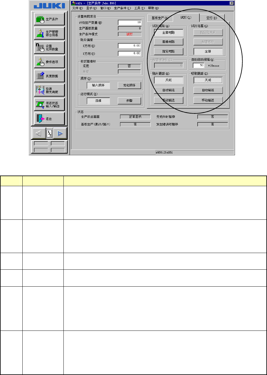 第1部 基本篇 第2章 生产 2-42 3) 空打 图 2.8.2.2.2 设定空打条件 No. 项目 内容 1 贴片范围 (步骤号) 需限定贴片范围时, 请输入开始步骤号和结束步骤号。 在总贴片点数 项中显示每 1 电路中的总贴片步骤号。仅能指定输入顺序。 2 自动传送间隔 自动传送跟踪时,请设定在停止位置上的停止时间。 以 10msec(0.01 秒)为“1”个单位。 3 贴片摄象机跟踪 空打基板后,对是否利用摄象机进行贴片点的跟踪…