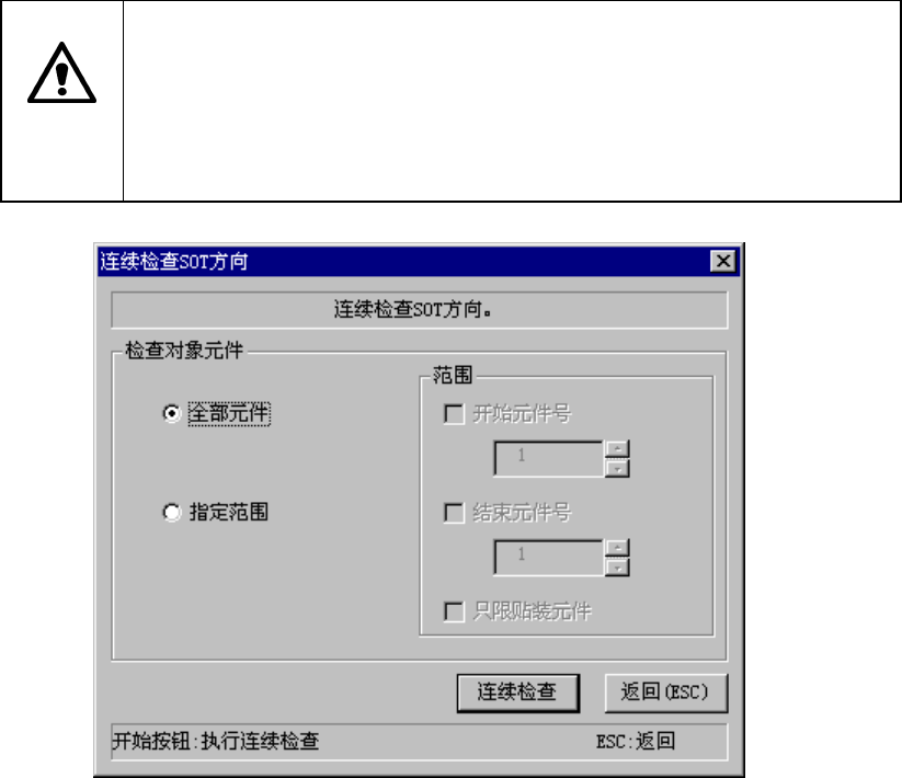 第 1 部 基本编 第 2 章 生产 2-89 5) SOT 方向连续检查 从菜单栏中选择 “工具” / “检查” / “SOT方向连续检查” , 显示如下画面。 单击 “连续检查” 后开始检查。 注意 按下“连续检查” ,贴片头立即移动,开始生产。 为避免人身伤害, 在运行过程中切勿将手放入装置内部, 也不要将脸和头靠 近装置。 在按下“连续检查” ,请务必确认装置内部无人作业。 在按下“连续检查”前,请确认装置附近没有会受到人身伤害…
