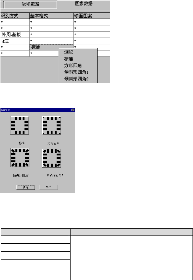 第1部 基本篇 第4章 生产程序制作 4-90 选择“参照”时则显示如下画面。请选择相应的基本样式,并按下“确定”。 图 4.3.7.3.9.2 图 4.3.7.3.9.1 基本样式 一览表 基本样式选择项目一览 内容 参照 显示从标准到标记散布的样品图,也可以从对话框中选择。 标准 包装外围只存在球的类型。 原有的 BGA 的小间距、小球板。在格子上的索引球也可。 索引标记 4角 索引球的配置为格子外的 4 角图。 索引标记 3角 索…