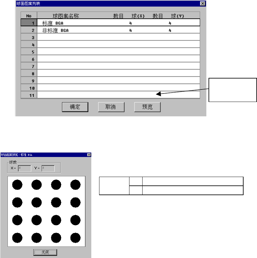 第1部 基本篇 第4章 生产程序制作 4-93 1) 参照 选择参照,显示如下的球图案一览表。 双击设置的球图案,或选择球图案后按下“确定”按钮。 将球图案从数据库中调出时,请调出设置了球 图案的元件数据(图像数据)。不能只直接调出 球图案。 图 4.3.7.3.10.1 球图案一览表 ● 球图案的预览对话框显示例 图 4.3.7.3.10.2 球图案的预览显示例 X 球的列数(横方向的球个数) 球数 Y 球的行数(综方向的球个数) 按…