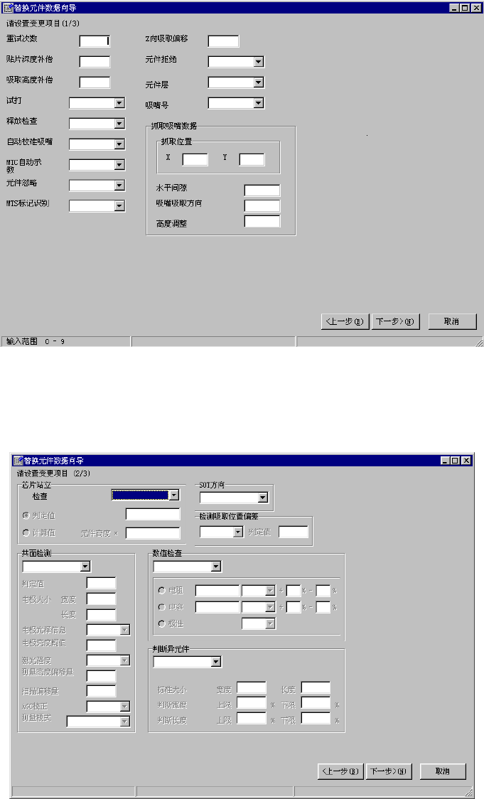 第1部 基本篇 第4章 生产程序制作 4-133 ② 替换值的设定 (1) 显示元件数据附加信息标签的内容。 分别对各数据输入想要变更的值,单击“下一步”。 图 4.5.1-8 替换设定画面(1) (2) 显示元件数据检查标签的内容。 分别对各数据输入想变更的值,单击“下一步”。 图 4.5.1-9 替换设定画面(2)