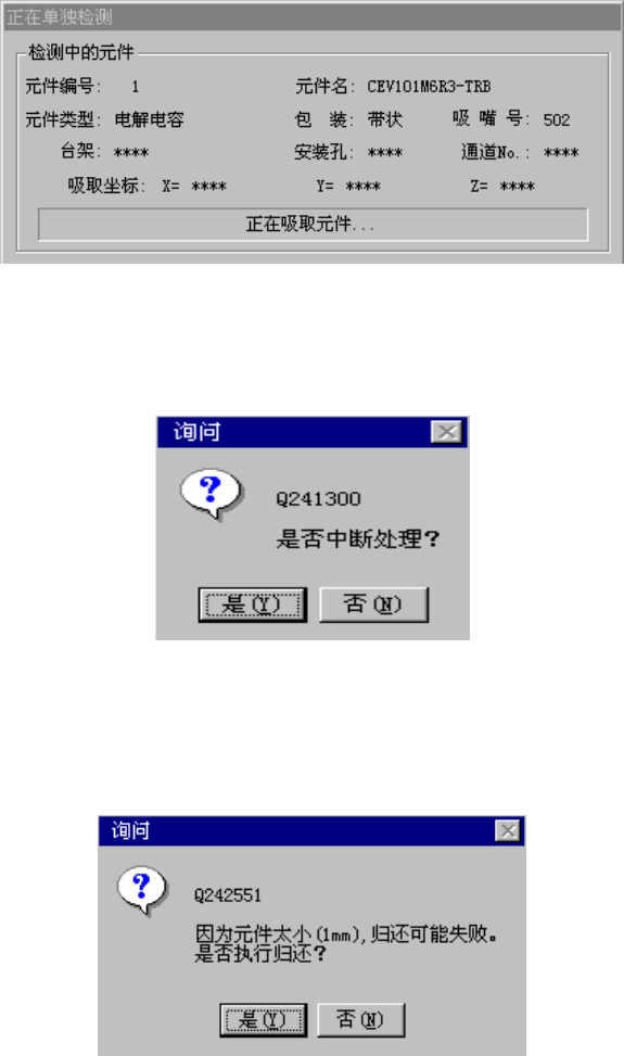 在单独检测过程中,显示如下的画面。显示正在进行单独检测的元件的内容及吸取位置,