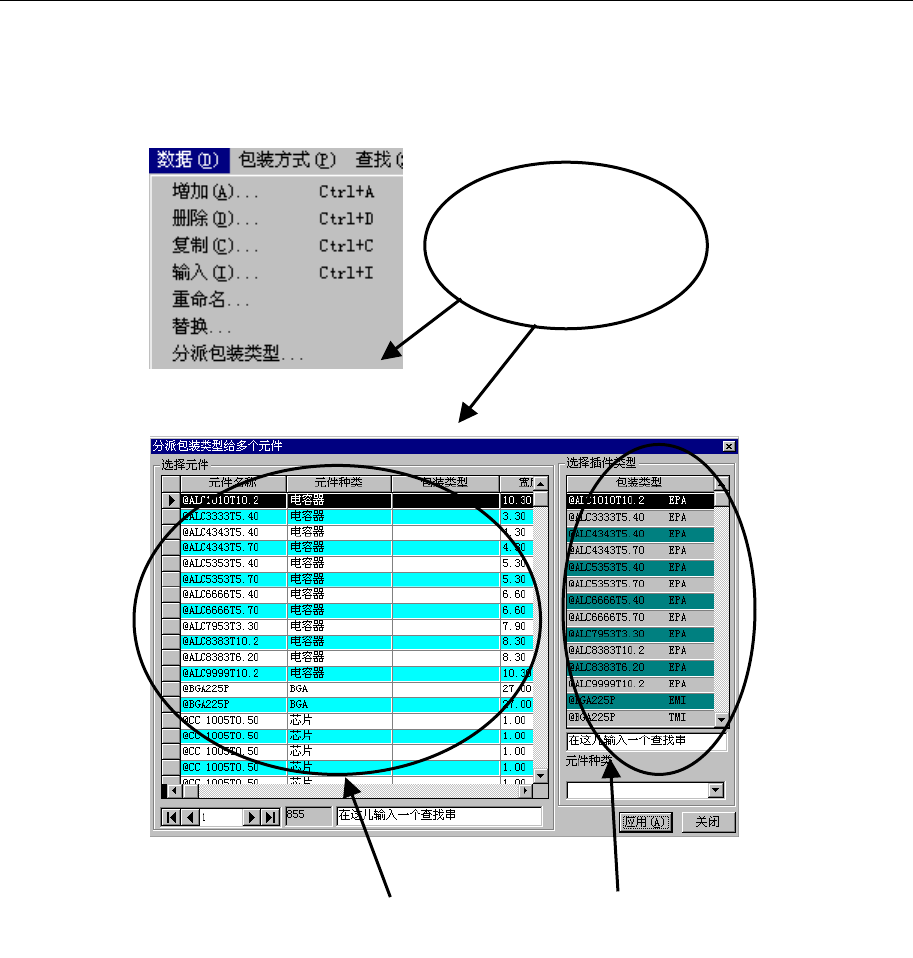 第1部 基本篇 第5章 数据库 5-20 5-4-6 包装方式(包装代码)分配 可对多个元件数据统一设定包装代码。 1) 在“数据”菜单中选择 “分派包装类型” ( 分配包装代码)后,显示如下画面。 在“分配 包装代码”画面上,显示元件数据一览表和包装代码一览表。 图 5.4.6-1 点击“分派包装类 型” ,显示 “包装代码 分配”画面 元件数据列表 包装代码列表 图 5.4.6-2